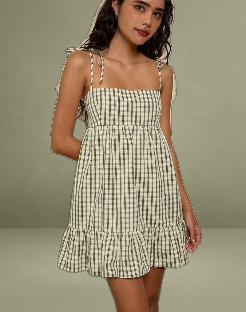 The Nikita mini dress in a green check seersucker fabric. Featuring adjustable tie straps and a square neckline. Complete in a smock style with lightly pleated hem.