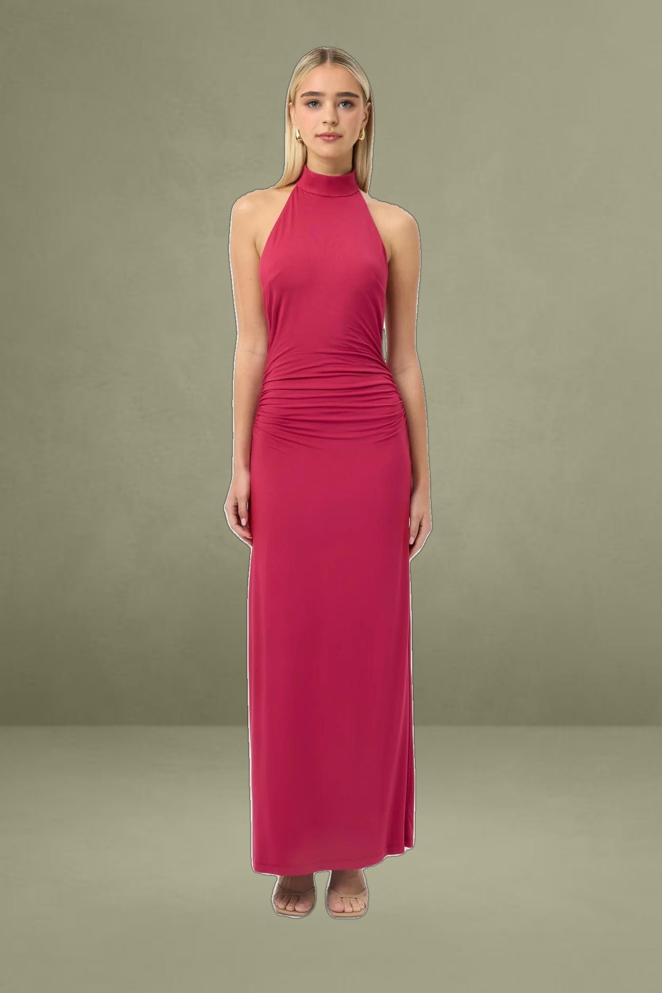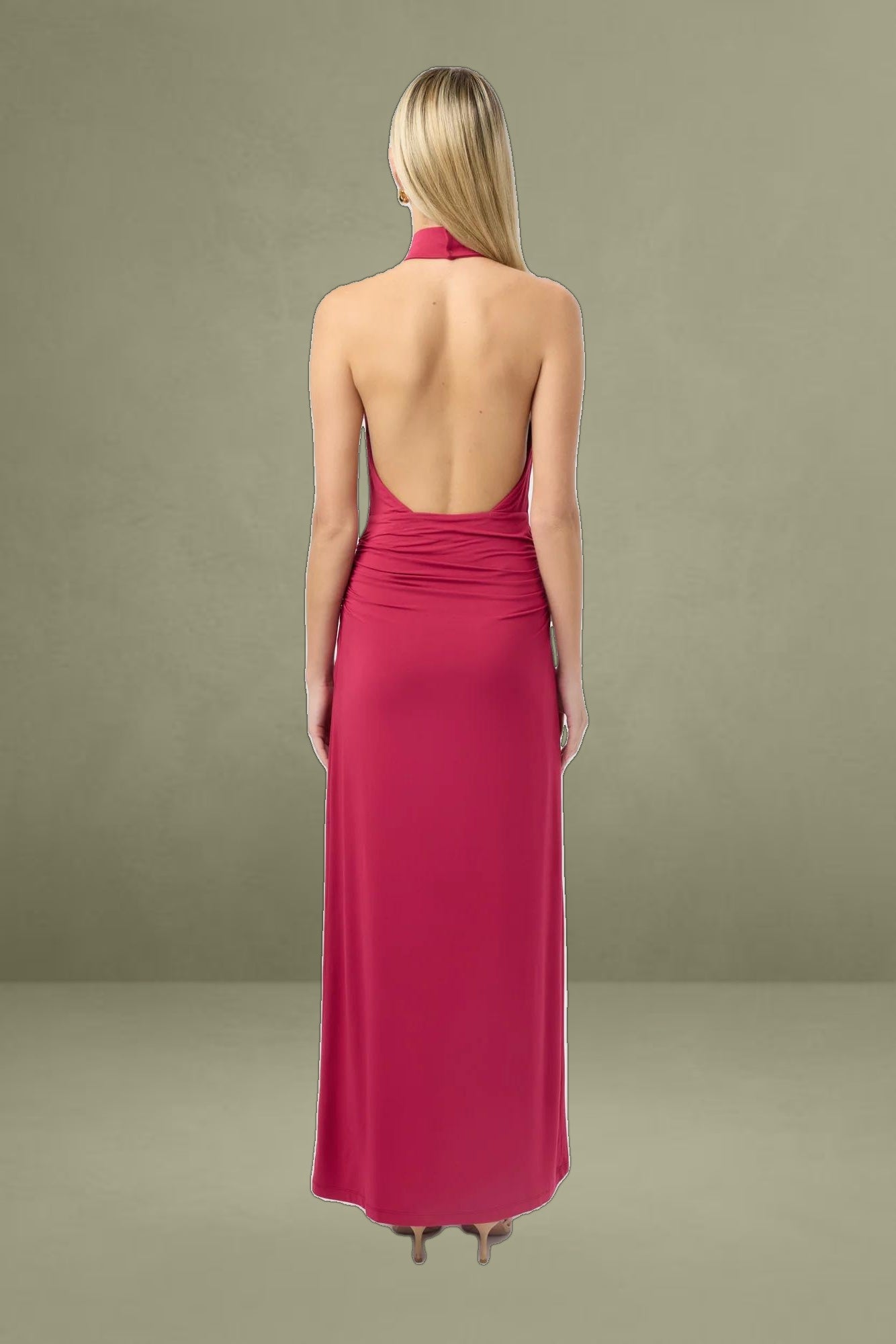 The Nikola Maxi Dress in Red Bud embodies effortless sophistication. Crafted from luxurious rayon jersey, this sleeveless design features a high neckline and low back, creating a flattering, figure-skimming silhouette. The flowing maxi length exudes refined elegance, making it an ideal choice for any formal occasion.