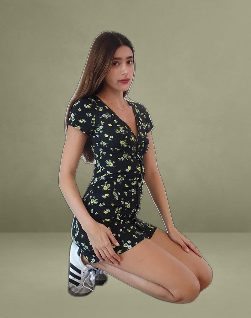 Omoni dress in black with lemon and lime floral print on SSR fabric base. A line floaty hem mini dress with regular short sleeves, seaming on the waist and v neckline.