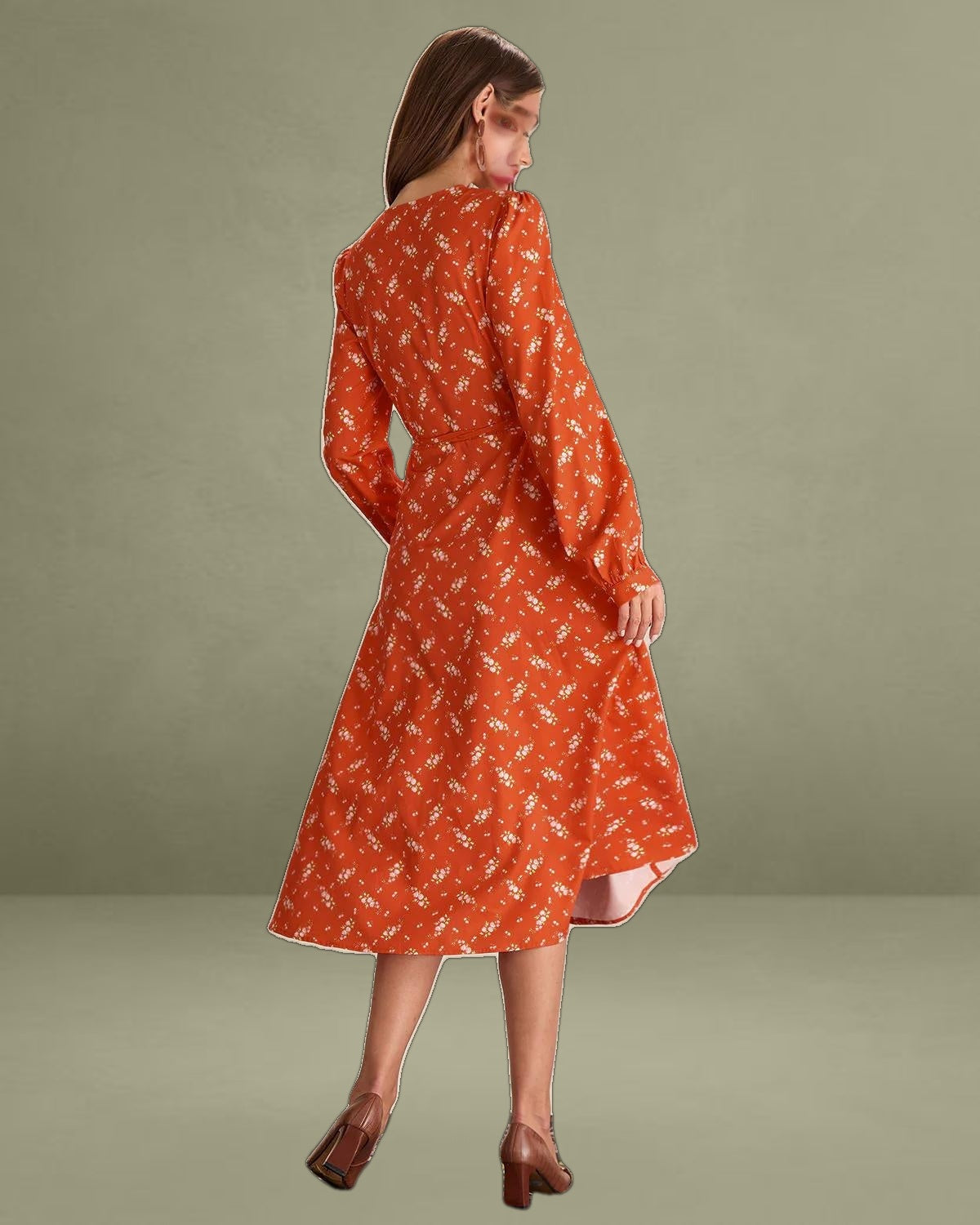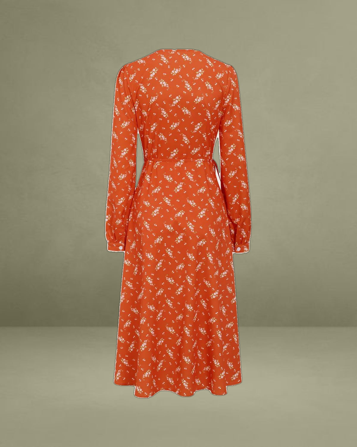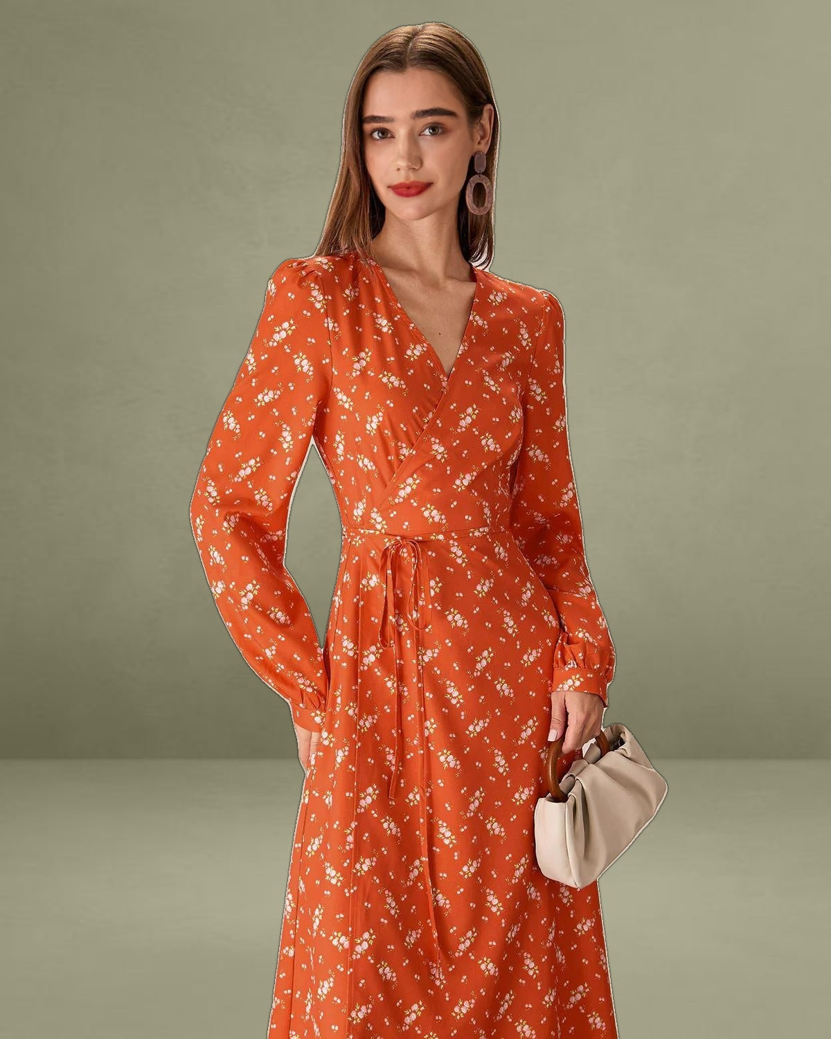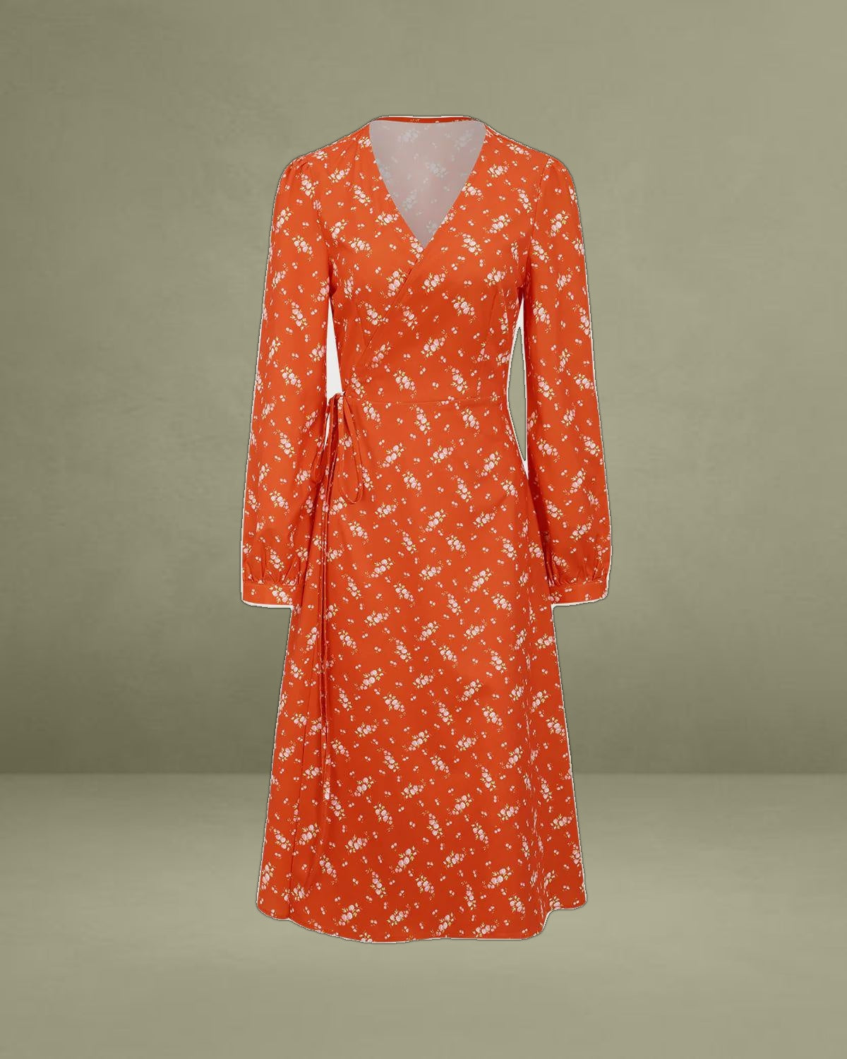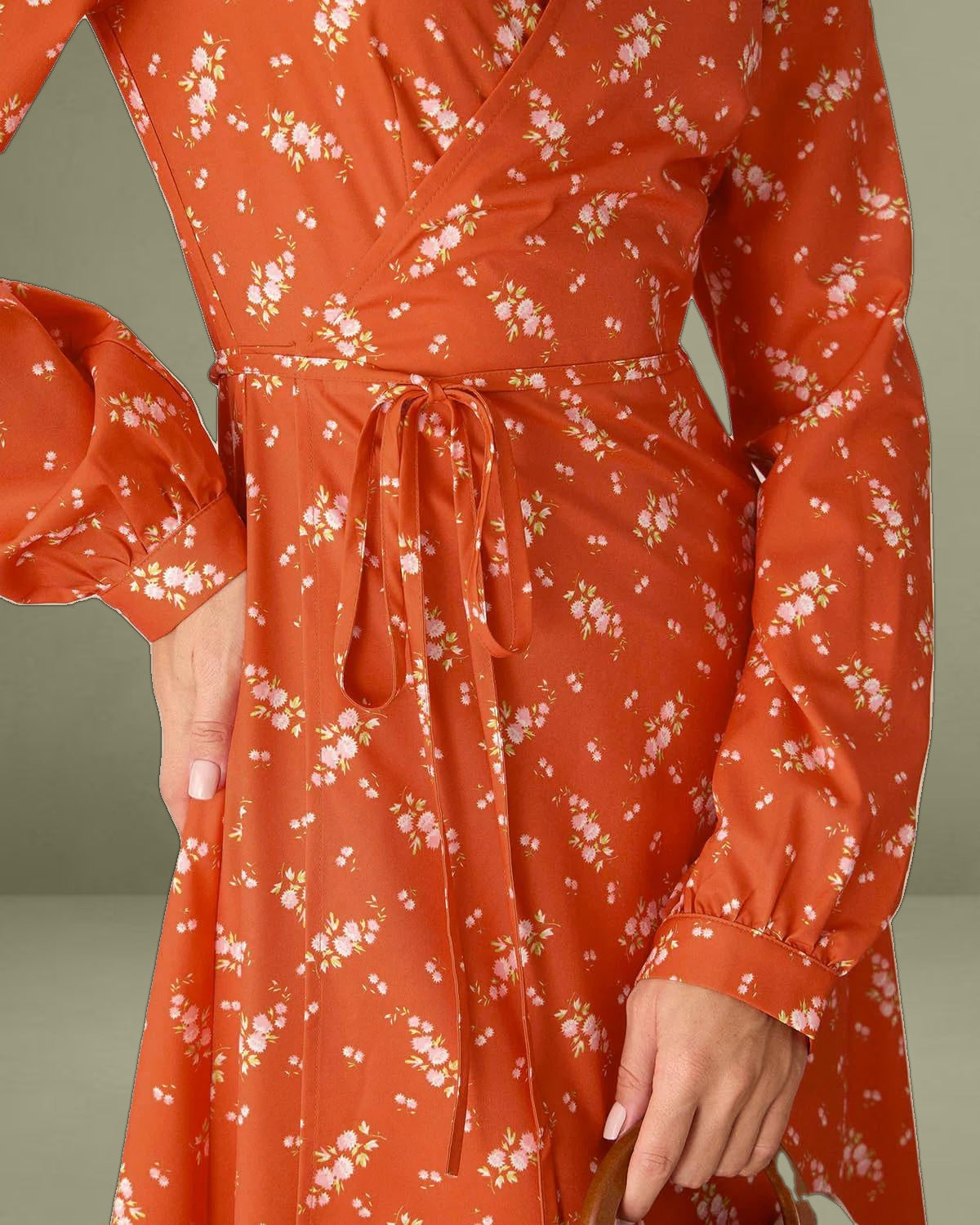 Featuring a flattering wrap design that cinches at the waist, it creates a beautiful, flowy silhouette. The bright orange hue is complemented by a delicate floral print, perfect for adding a touch of spring or summer to any wardrobe.