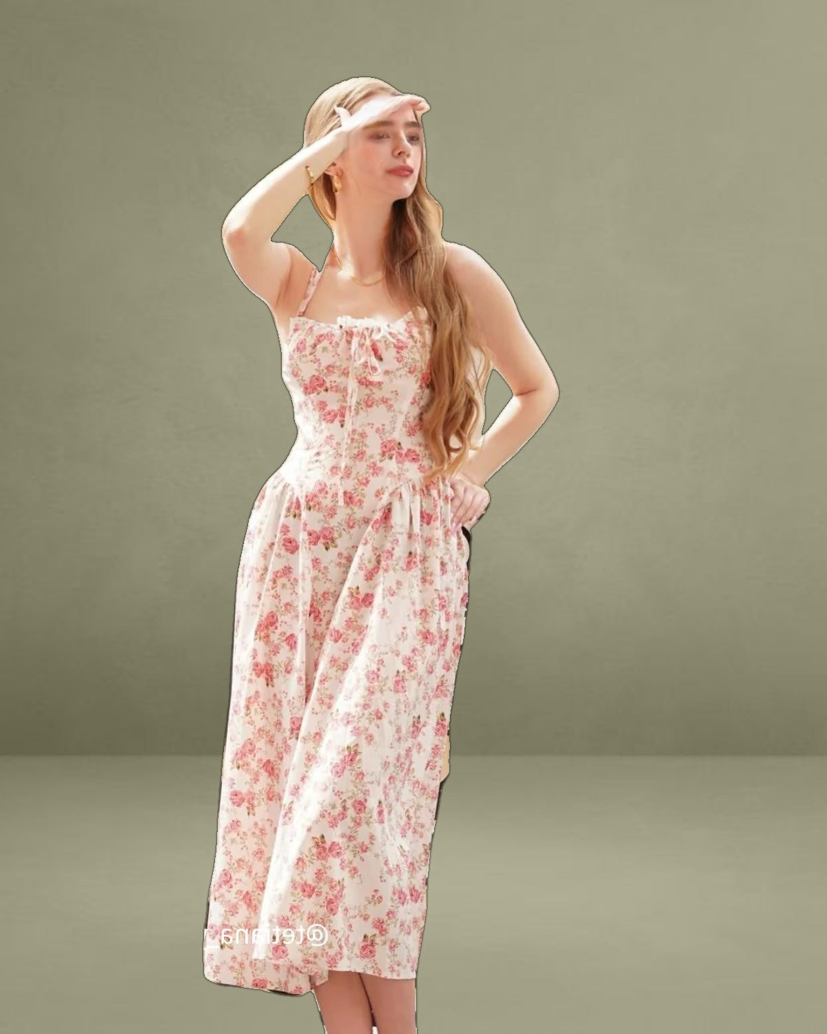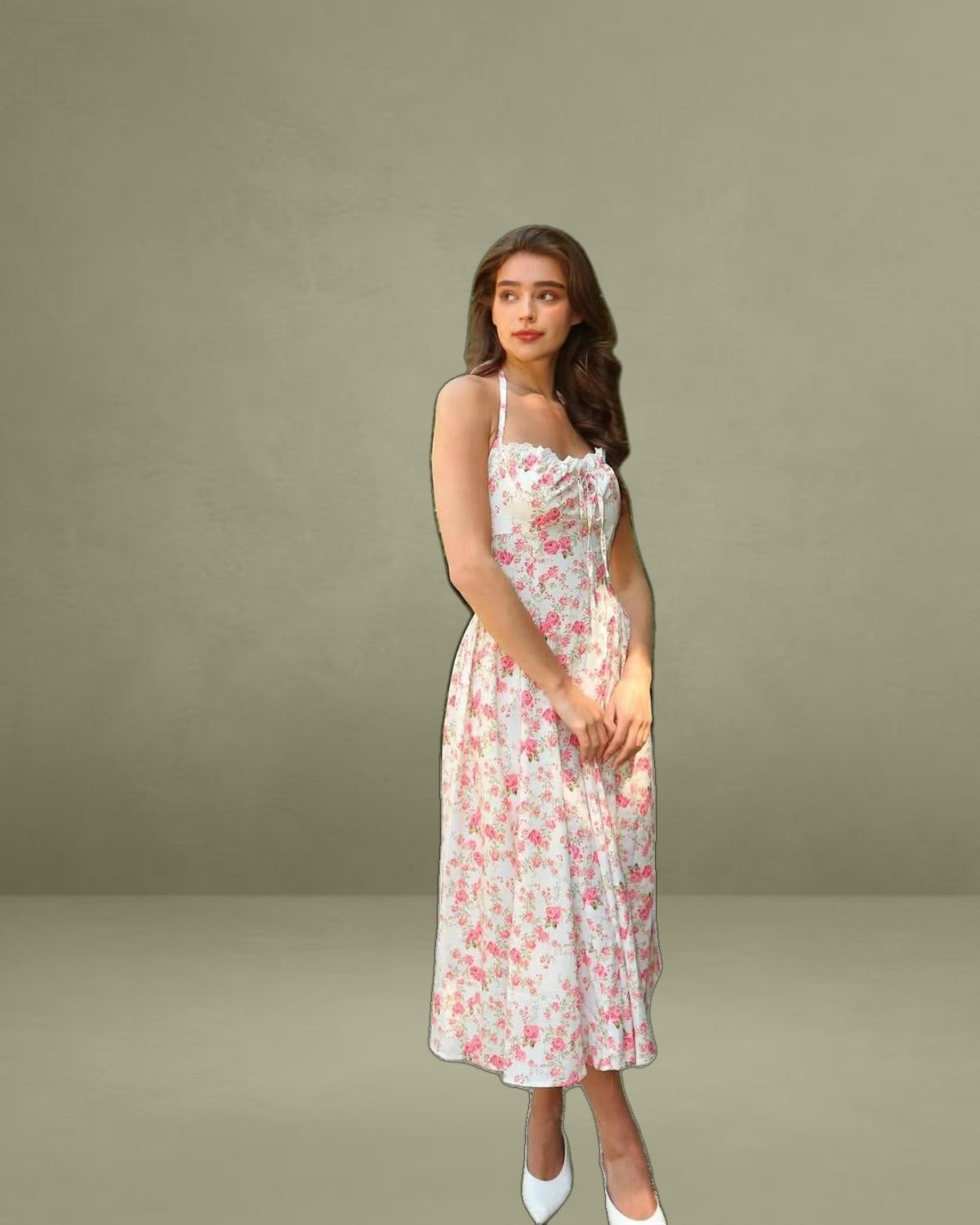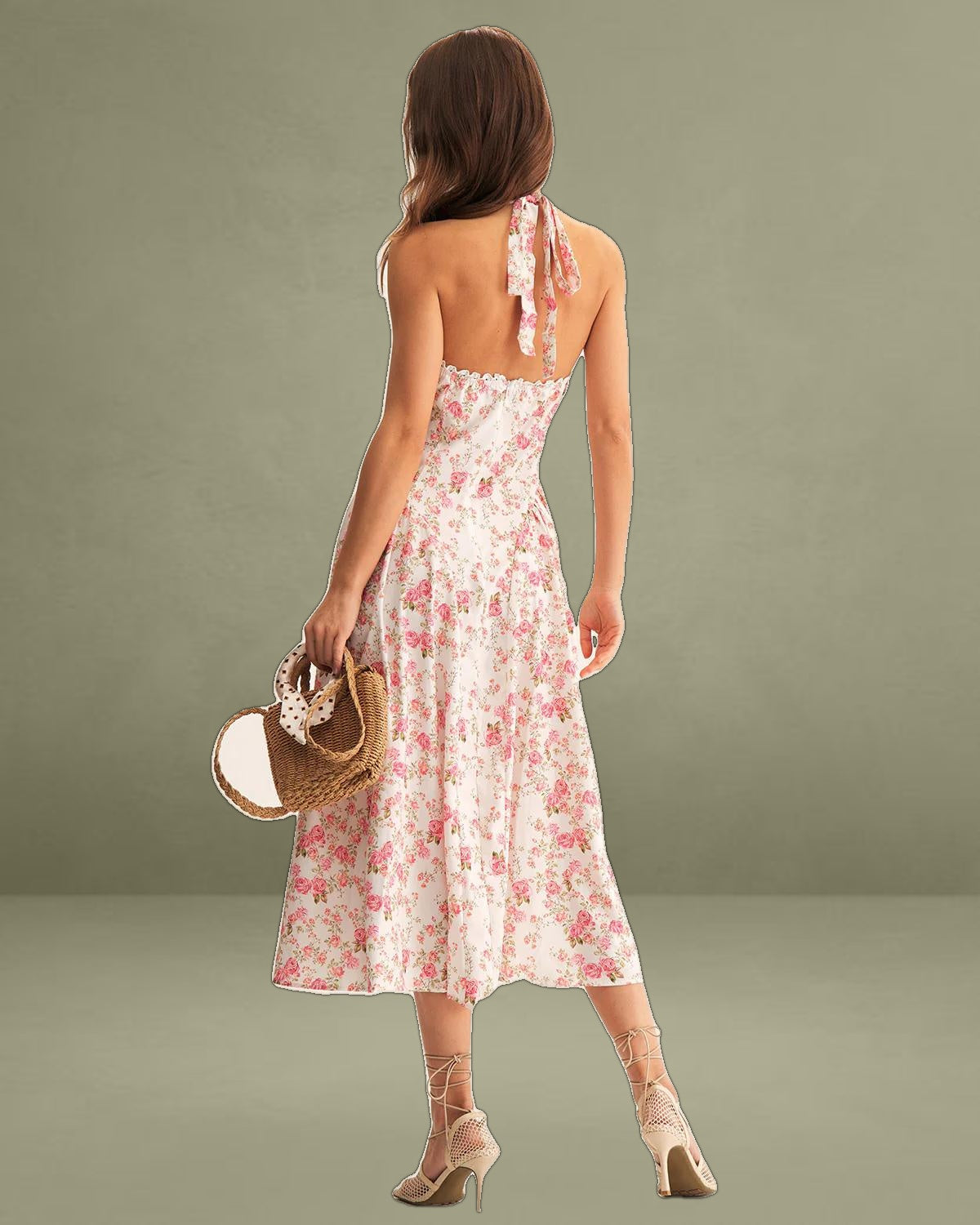 The Pink Floral Halter Midi Dress is a dreamy, feminine piece that combines a vibrant floral print with a flattering halter neckline. The soft pink background is adorned with colorful blooms, making it perfect for spring or summer events. The figure-enhancing fit features a flowing midi-length skirt that offers both comfort and style.