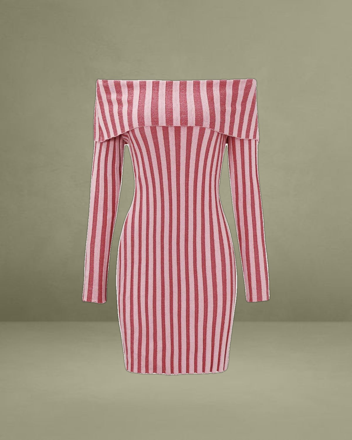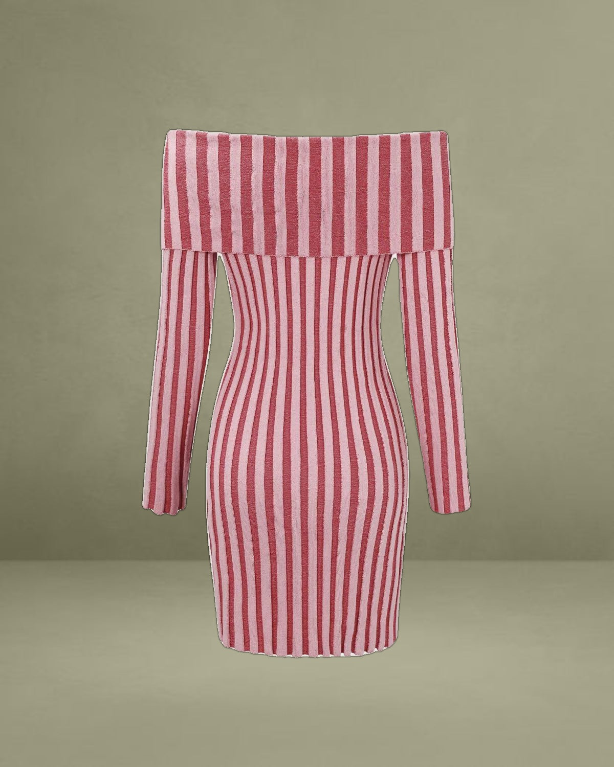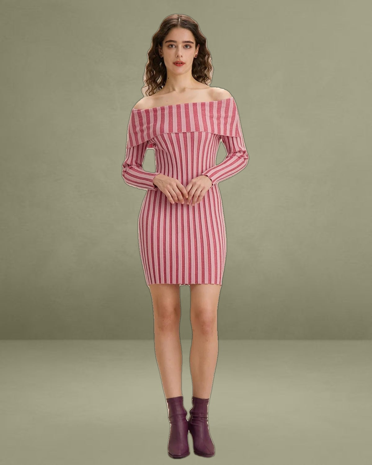 The soft, stretchy knit fabric hugs your curves for a flattering silhouette, while the off-the-shoulder design adds a flirty, feminine touch. Bold pink stripes give it a fun, trendy look, making it ideal for both casual outings and date nights. Whether paired with heels or sneakers, this dress offers comfort and style.