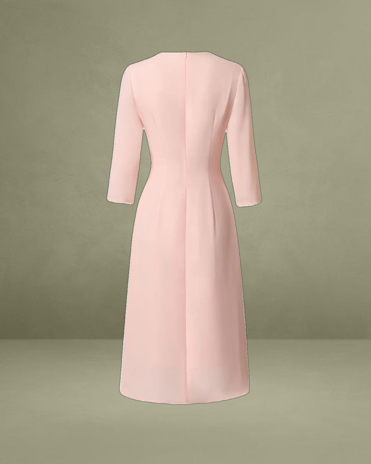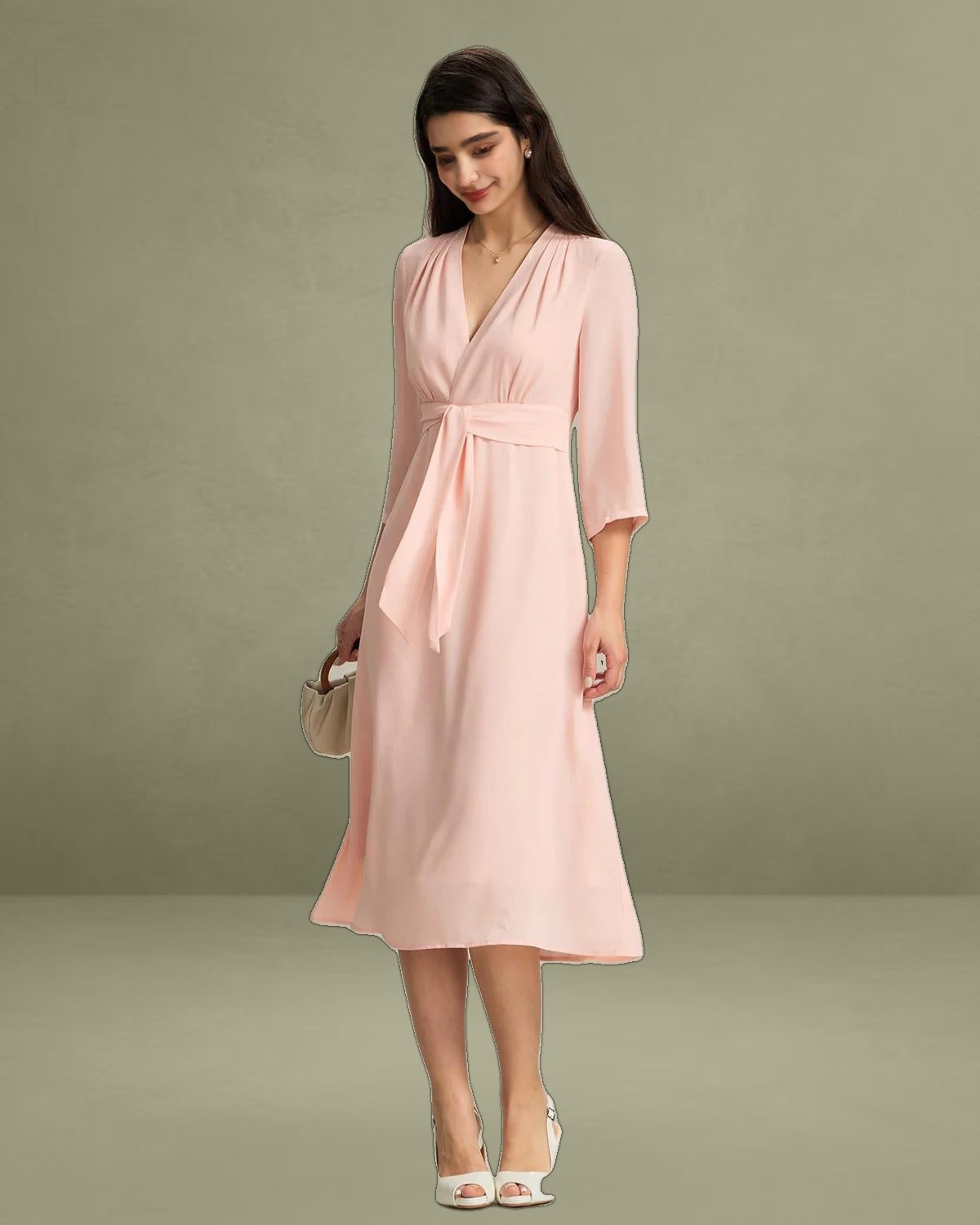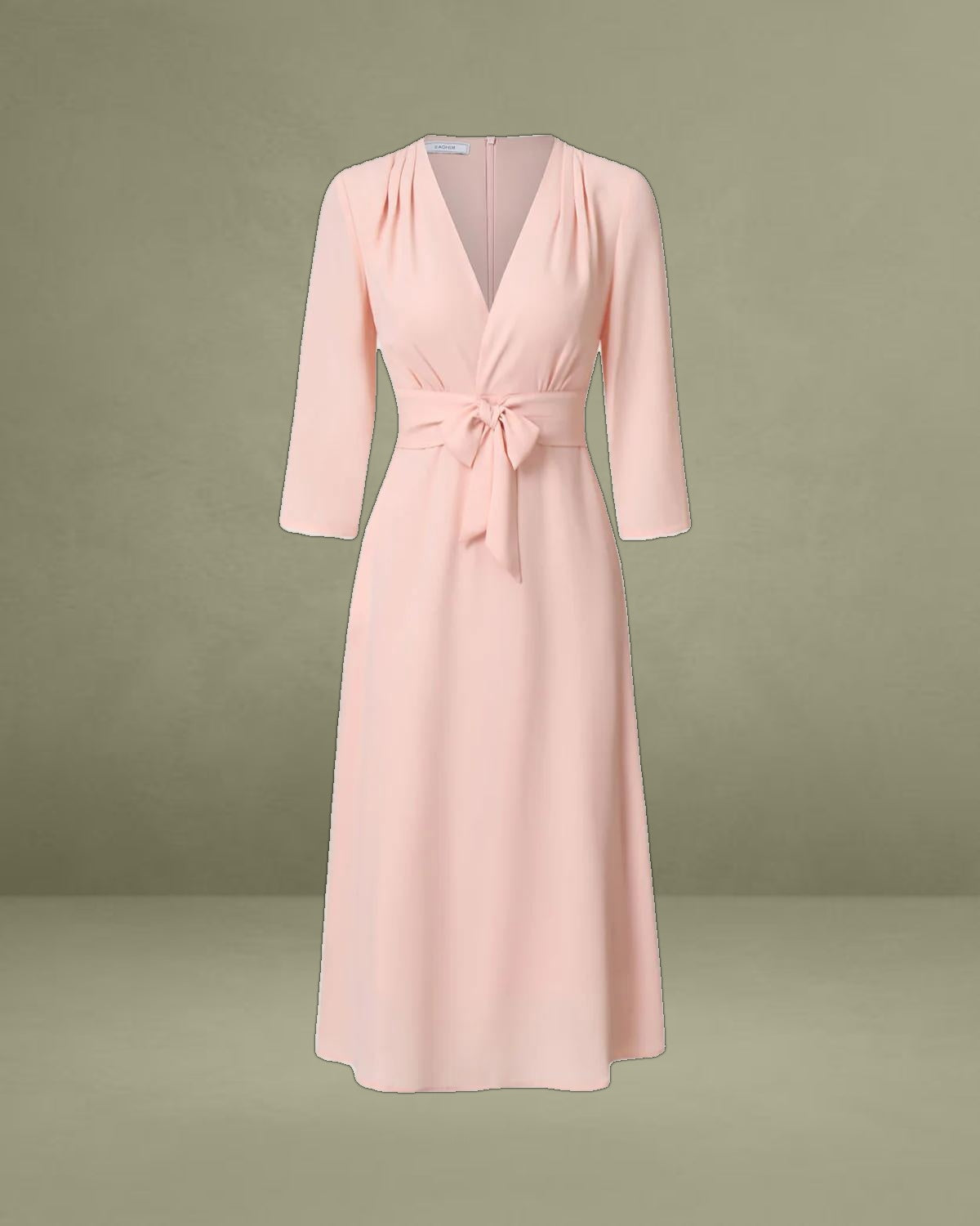 Featuring a flattering V-neckline and flowing pleated skirt, this dress creates a graceful silhouette ideal for both daytime events and evening occasions. The soft pink hue adds a touch of femininity, while the midi length offers timeless sophistication.