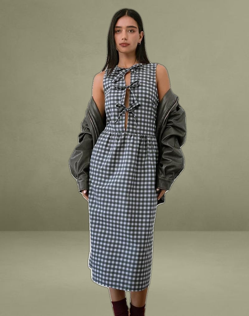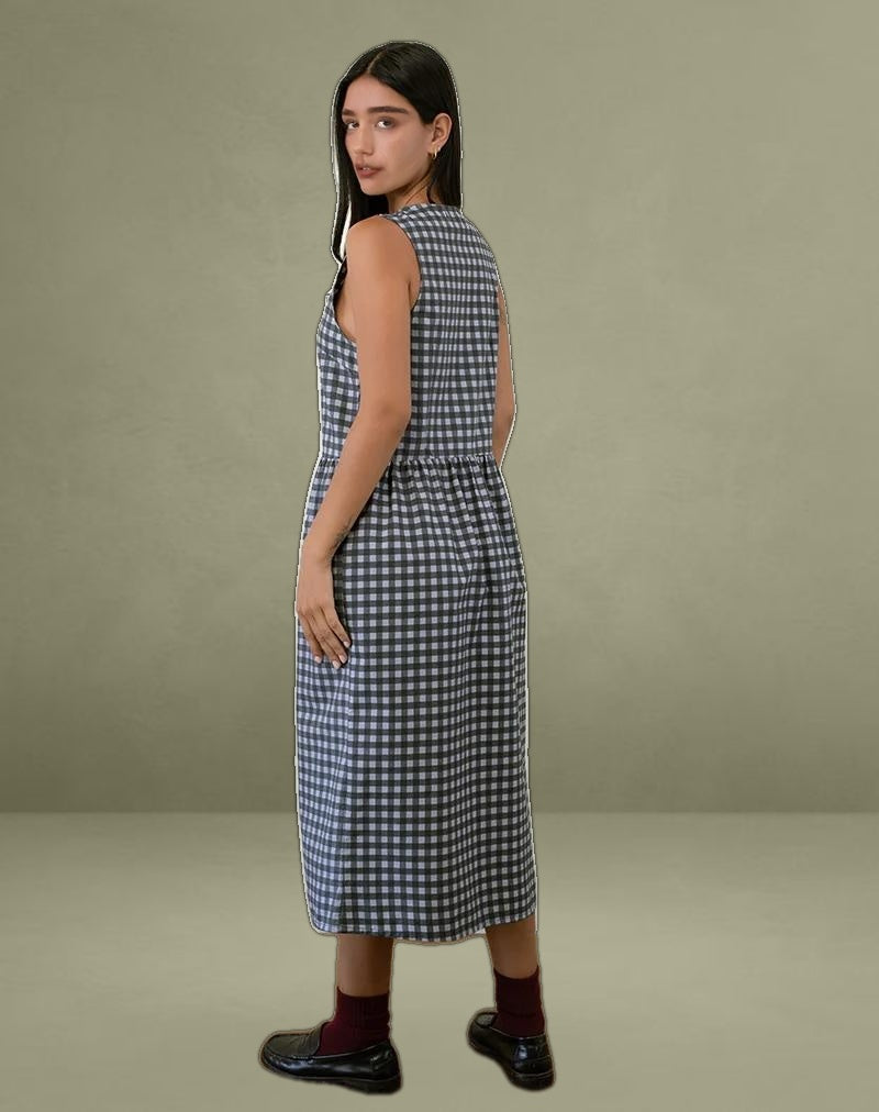 Gingham season wouldn't be complete without our Prelith dress. A loose smock midi dress, Prelith features a sleeveless design, crew neckline and gathered waistline. Complete with a three bow fastening down the centre and finished in a black grey tonal gingham. Style with our Cavita jacket.