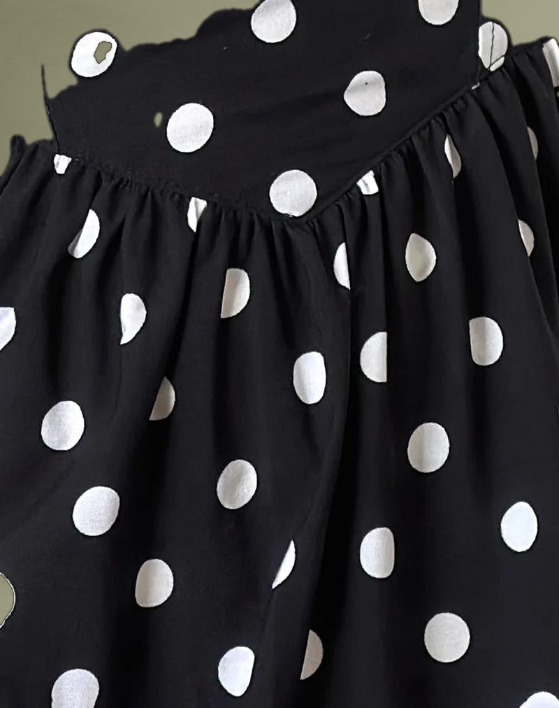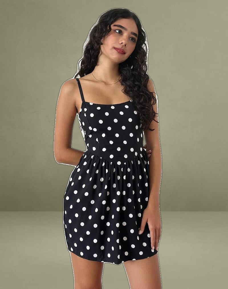 Square neckline mini dress, Ramana features thin cami straps, a drop v waist and gathered skirt finished with a shirred back in a lightweight viscose with white and black polka print.