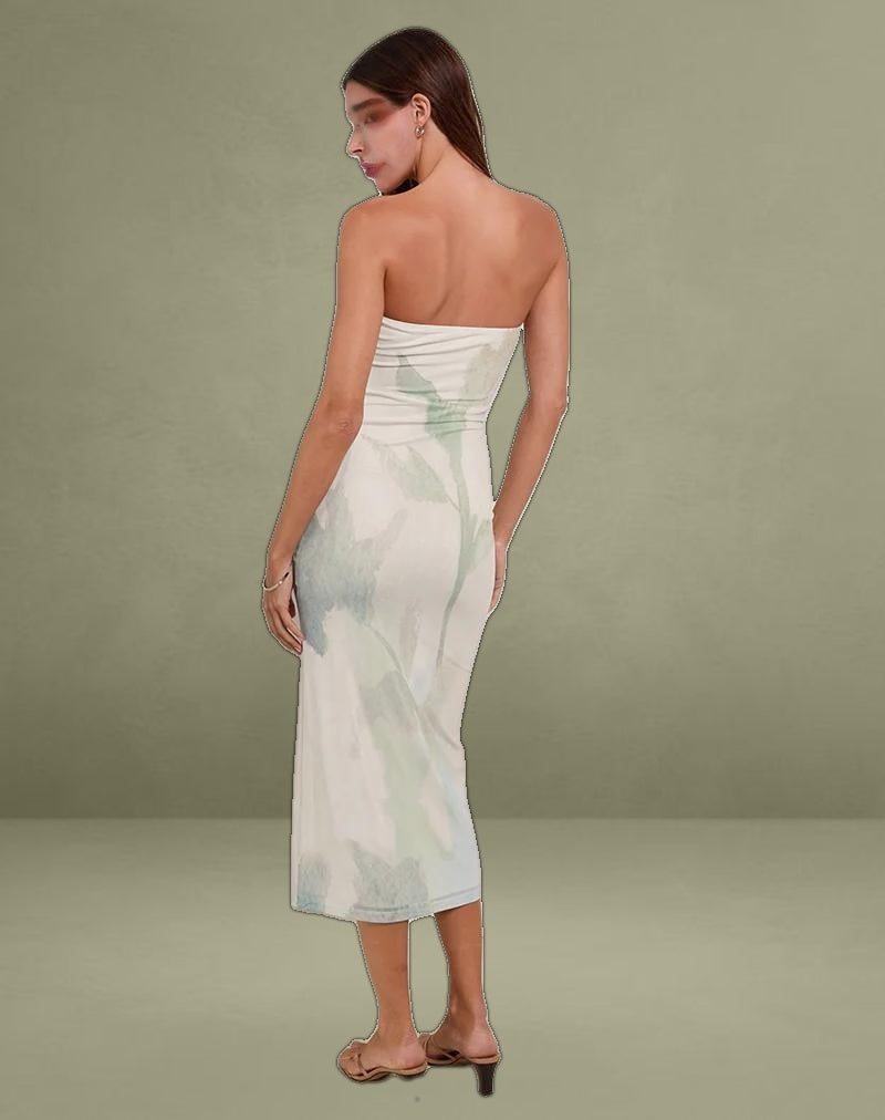 The Rosbandi dress in mesh with an abstract flower painted print. Features a bandeau, strapless design and a midi length fit.