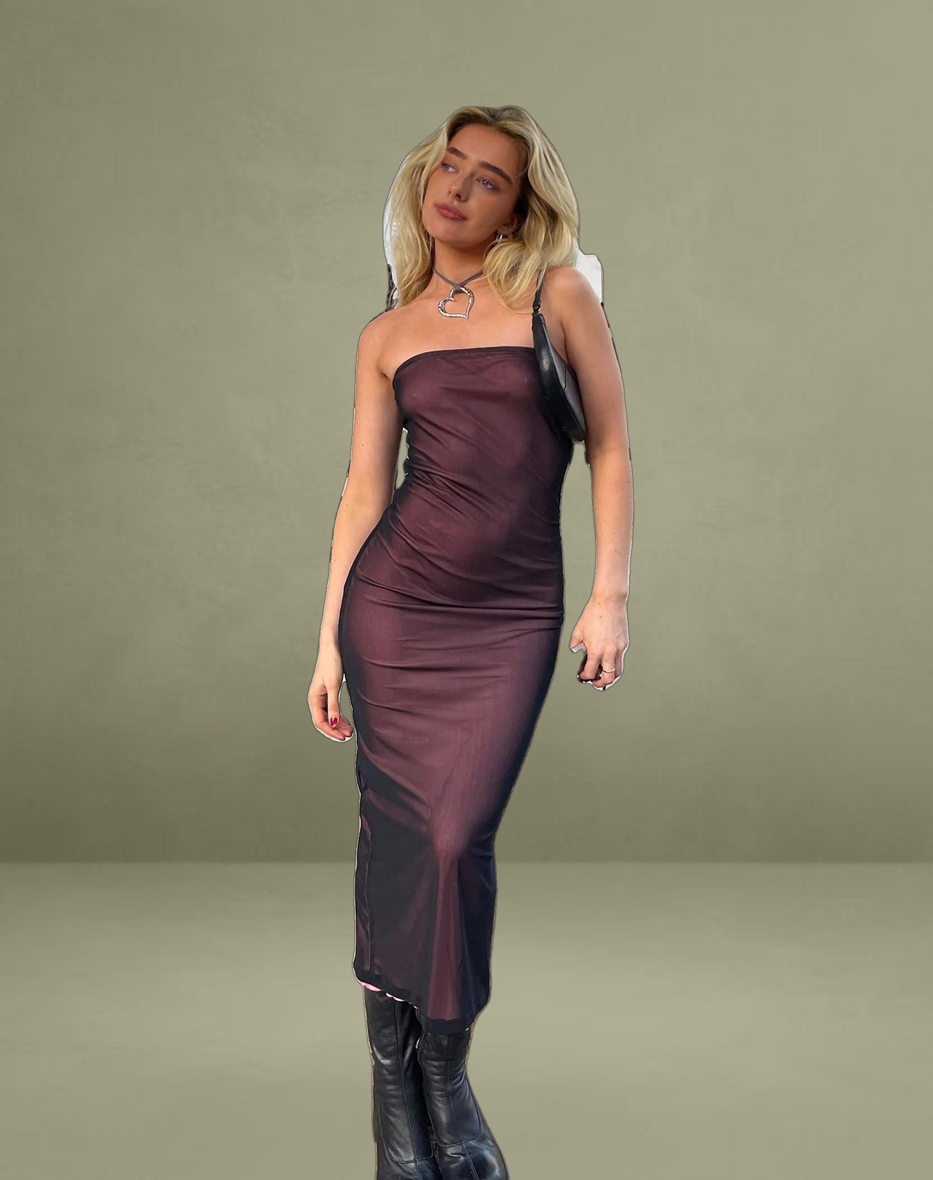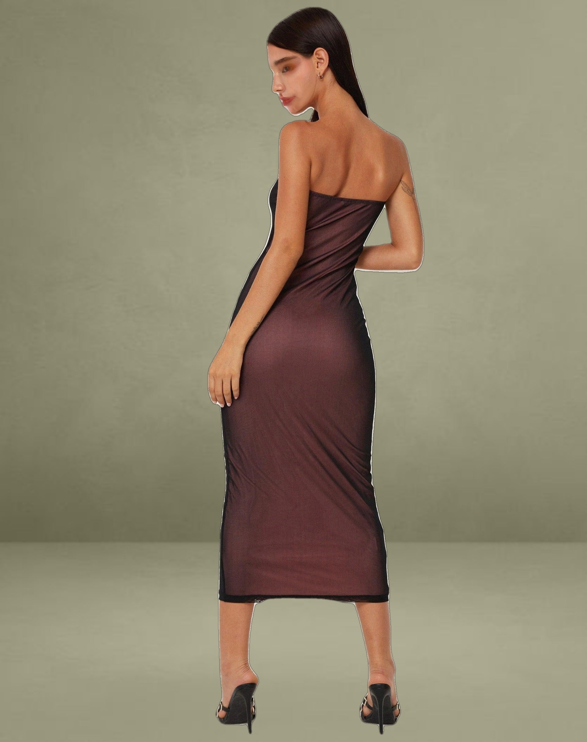 Our Rosbandi dress is the perfect party dress. In pink with black mesh lining, it features a bandeau strapless design and is midi in length.