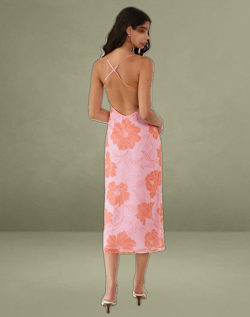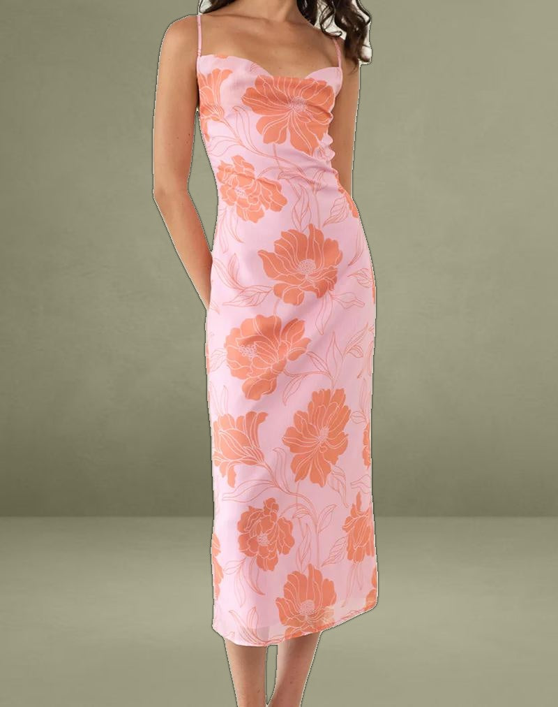 The Rujira dress in a pink and orange floral printed chiffon is a midi-length slip dress featuring a soft cowl neckline, adjustable cross-back straps, and a concealed side zip for a flattering fit.