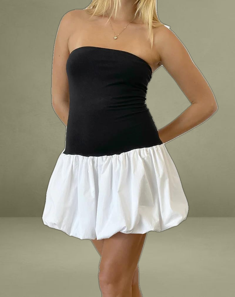 The Salvia mini dress features a black bandeau top half with bodycon fit, leading into a white puffball bottom half in a mini length.