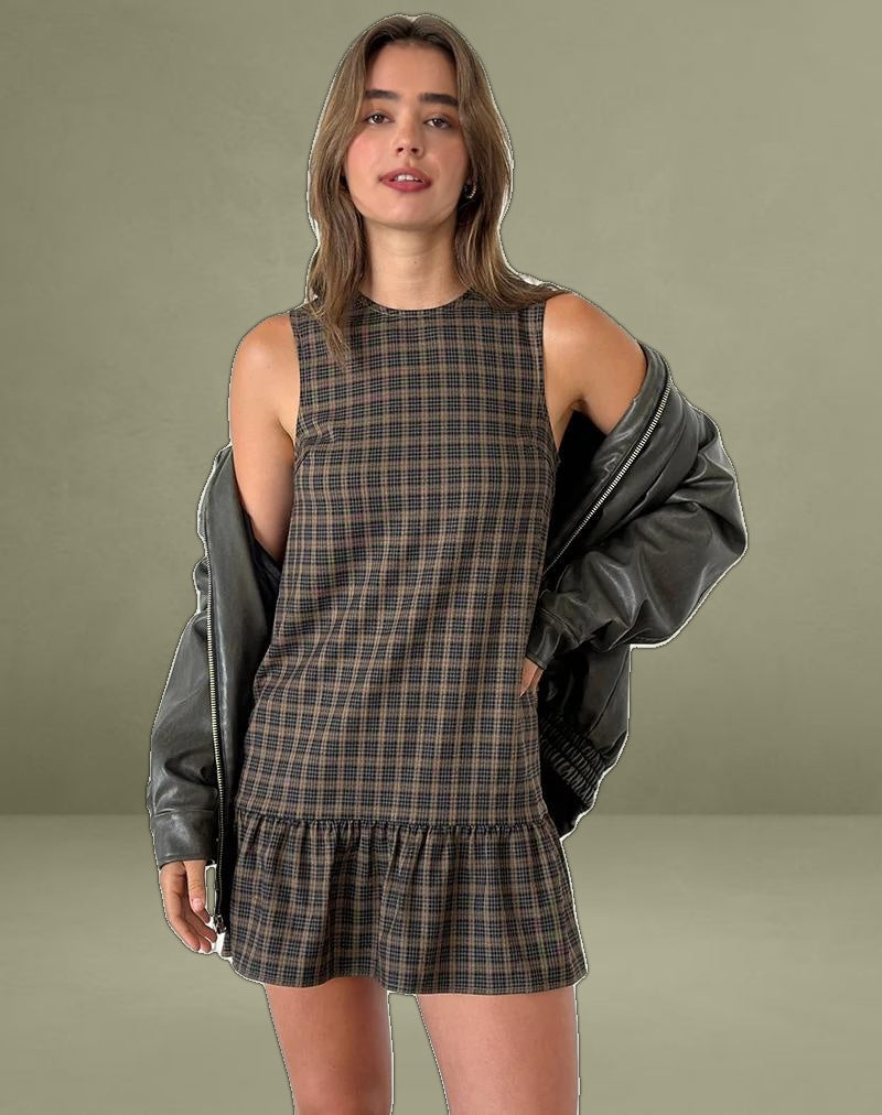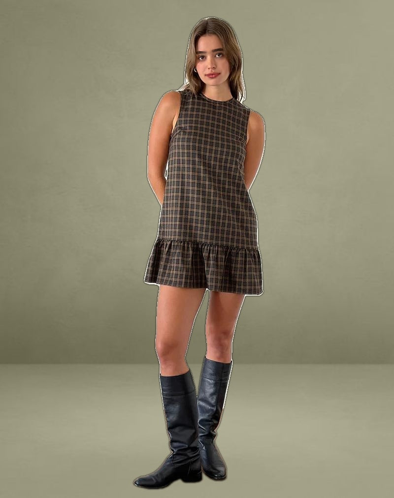 Our Samana Babydoll dress features a high neckline in a brown check pattern, this mini dress offers a dropped waist complete with a pleated hemline. Pair with our Lupita jacket.