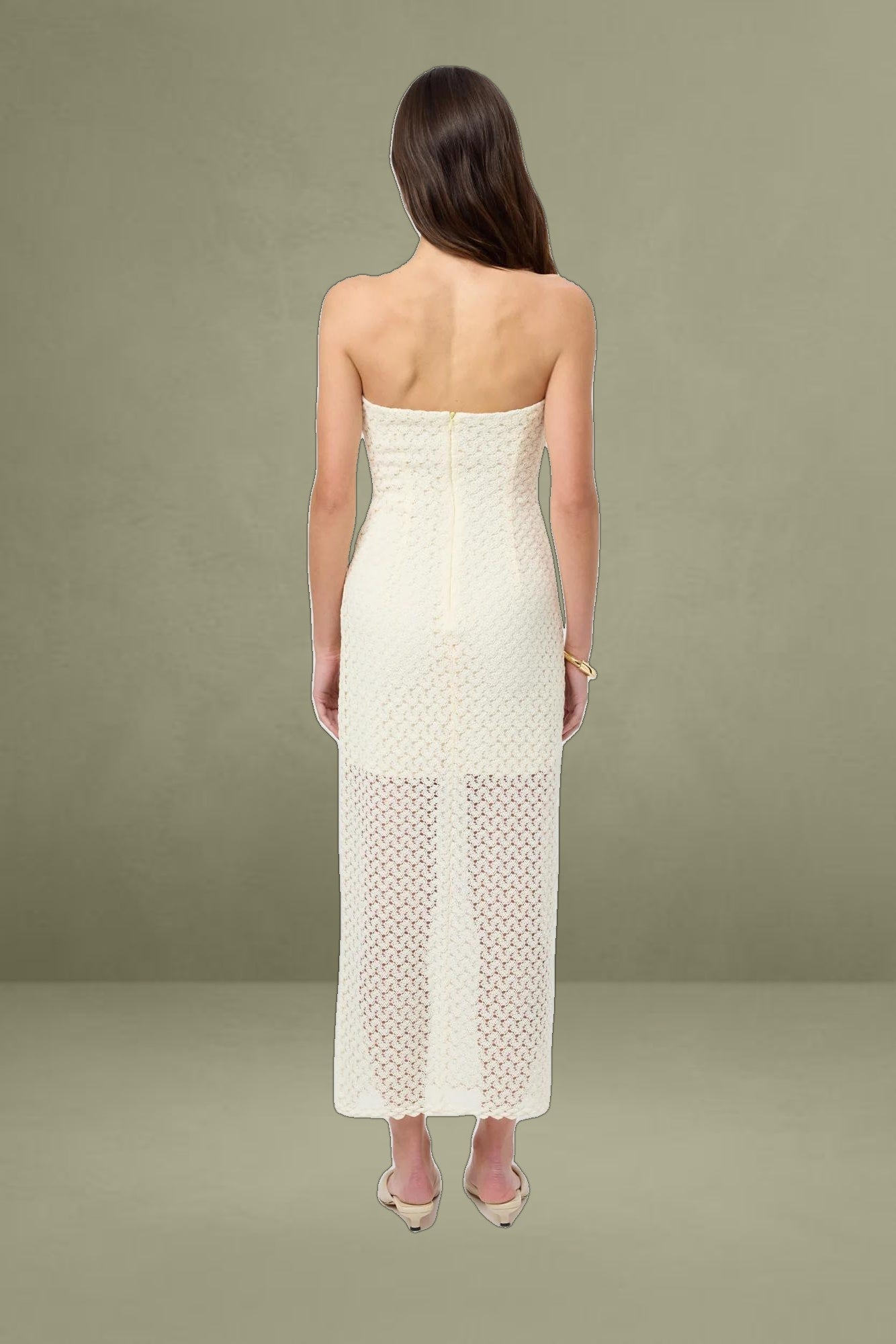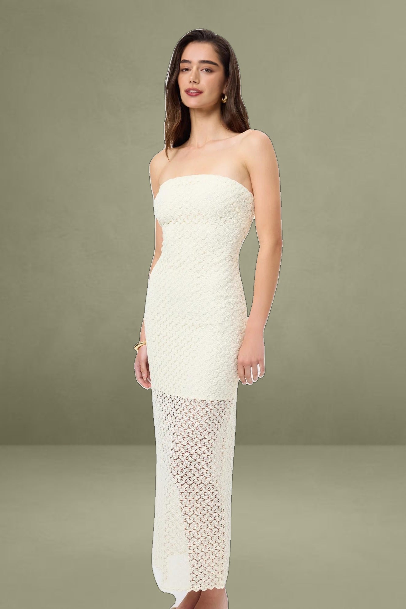 Introducing the Savannah Strapless Dress in a light Vanilla colourway, the perfect statement addition to your resort capsule. Crafted with a knitted crochet fabrication, this slim-fitting and delicate silhouette is with optimum wearability in mind. Featuring a mini-length slip and seamless rear zip allowing you to wear from beach to bar.
