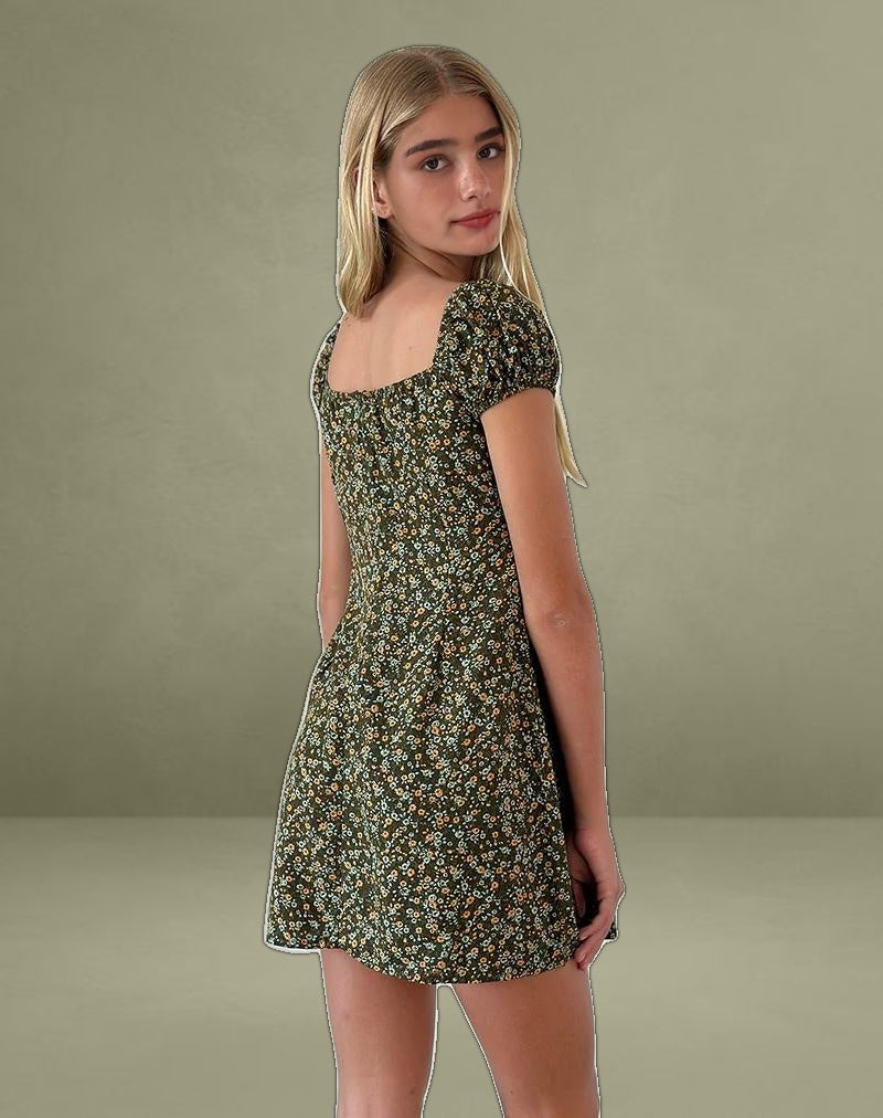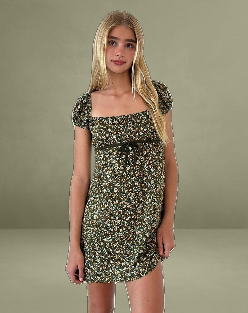 Square neck, puff sleeve mini dress. Savio features a loose skirt, ruching for shaping under bust finished with a binding and centre front bow in a grunge floral khaki print in a non stretch light weight viscose fabric.