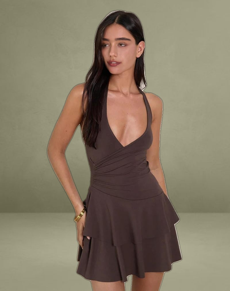 The Semary dress in a bitter chocolate rayon jersey fabric, features a halterneck plunging neckline with wrap design, mini length fit and a layered frill hemline.