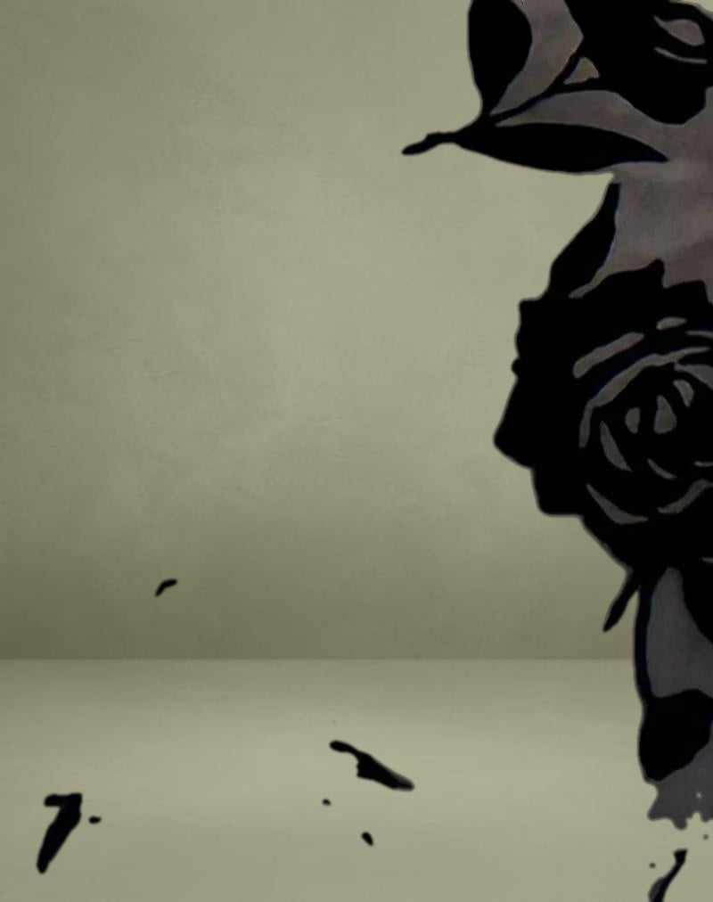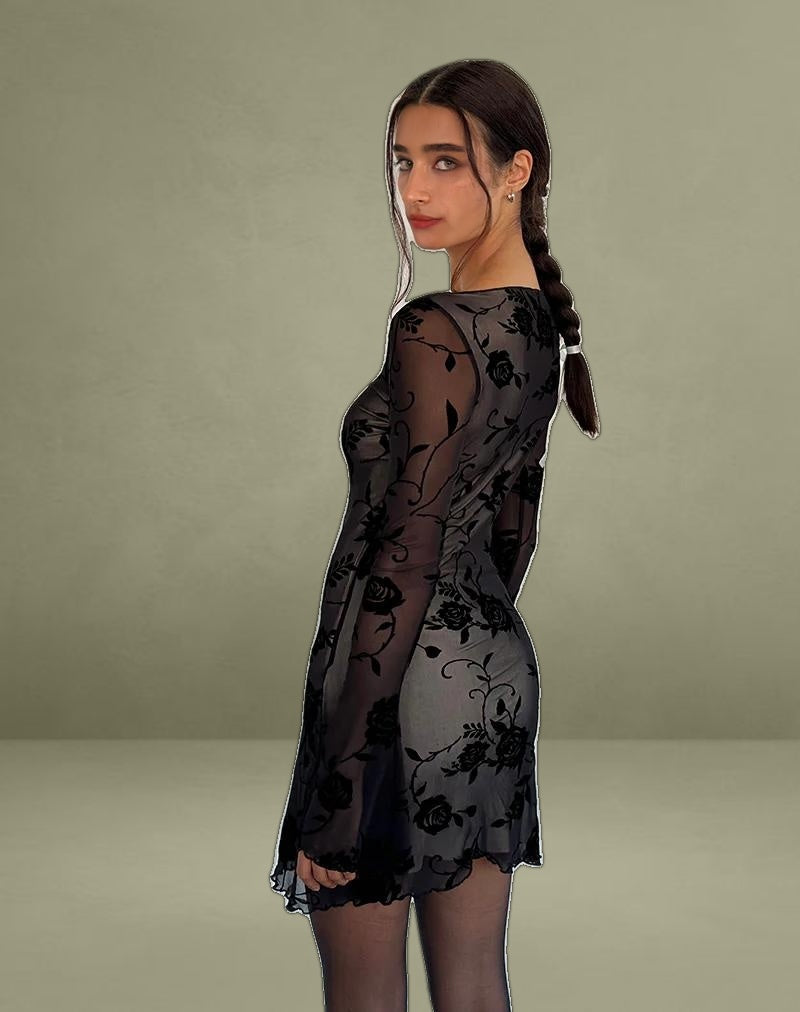 Wide neck mini dress with long fluted sleeves and flowy skirt finished with a baby-lock stitch on a black mesh base with tonal rose print in flock, with a nude jersey lining. The perfect dress for your next date night.