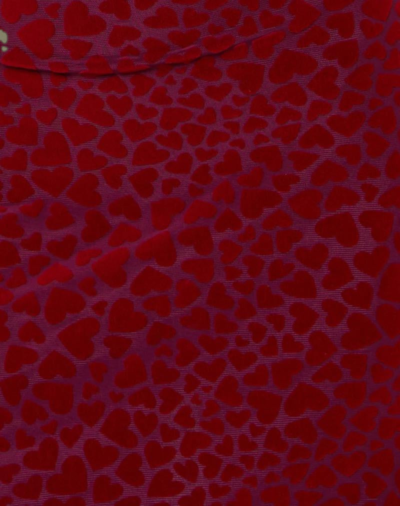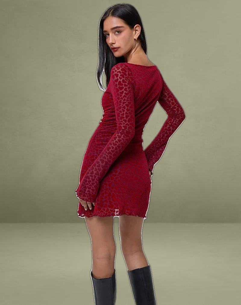 The Sevila dress features a bodycon silhouette that falls mini length with long, flared sleeves and a boat neckline in a stretch mesh fabric. In a maroon heart flock print, it comes fully lined with a scalloped hem detail.