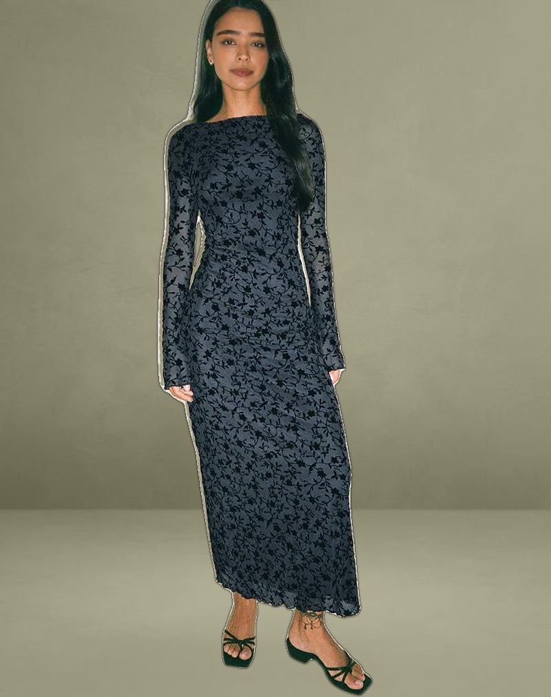 The Shaleed dress features a bodycon silhouette that falls maxi length with long, flared sleeves and a boat neckline in a stretch mesh fabric. Finished fully lined with a scalloped hem detail in a navy pretty petal flock print.