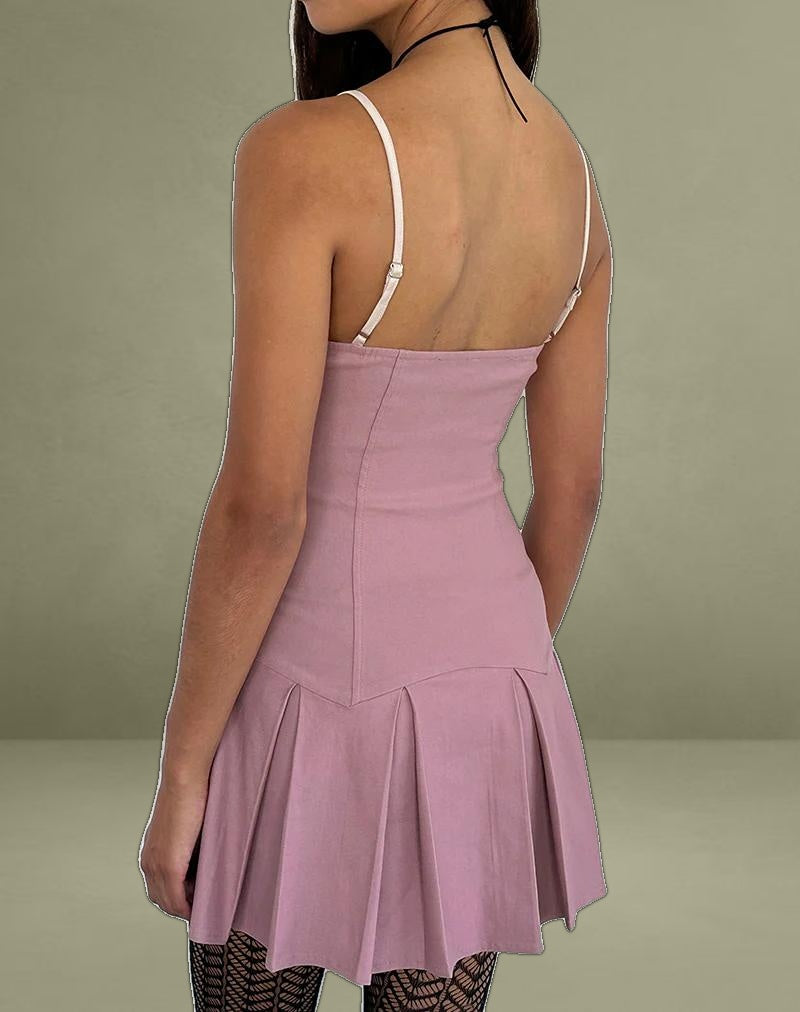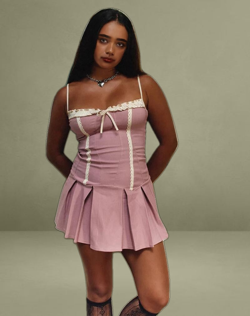 Our Shirina dress features a mini length, square neckline and thin cami straps. It also boasts a pleated skirt with corset style top in dusky pink, finished with lace and bow detailing's. We've finished ours off with a kitten heel combo.