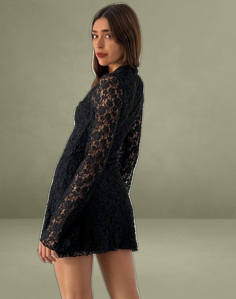 The Silvanna Dress in black floral lace, beautifully lined, features an elegant keyhole detail at the neck with a delicate mini ruffle inside the edge of the keyhole. It showcases pearl button fastening, a mandarin collar, fluted sleeves, and a flattering a-line fit.