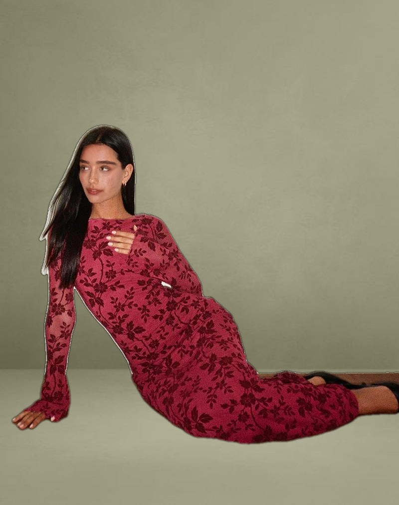 The Slokya displays long oversized flared sleeves. Featuring a boat neckline and maxi length. Complete with an all over cherry red floral flock pattern.