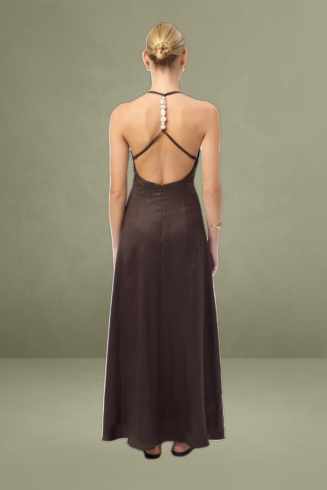 Channel effortless, luxe in our Tahiti Bead Maxi Dress. In a rich, versatile Dark Chocolate colourway. The flattering halterneck design leads to a deep V-neck, while the full-length skirt drapes elegantly for a graceful silhouette. The open back, featuring a distinctive row of organic-inspired beads that add an artisanal touch. Perfect for a summer evening event or a destination getaway.