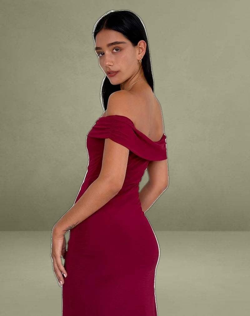 The must-have occasion dress is here. The Tarna dress features a bardot neckline, ruched detail on the sleeve and a side split in a maxi length mesh burgundy material.