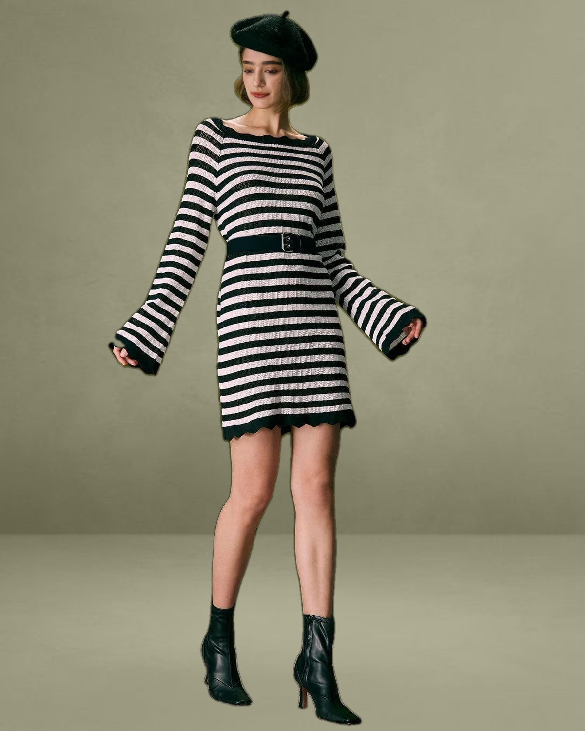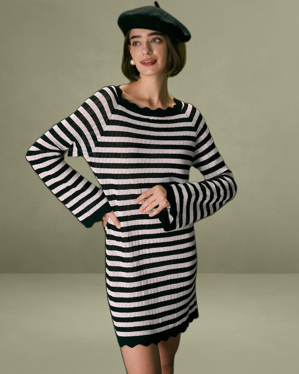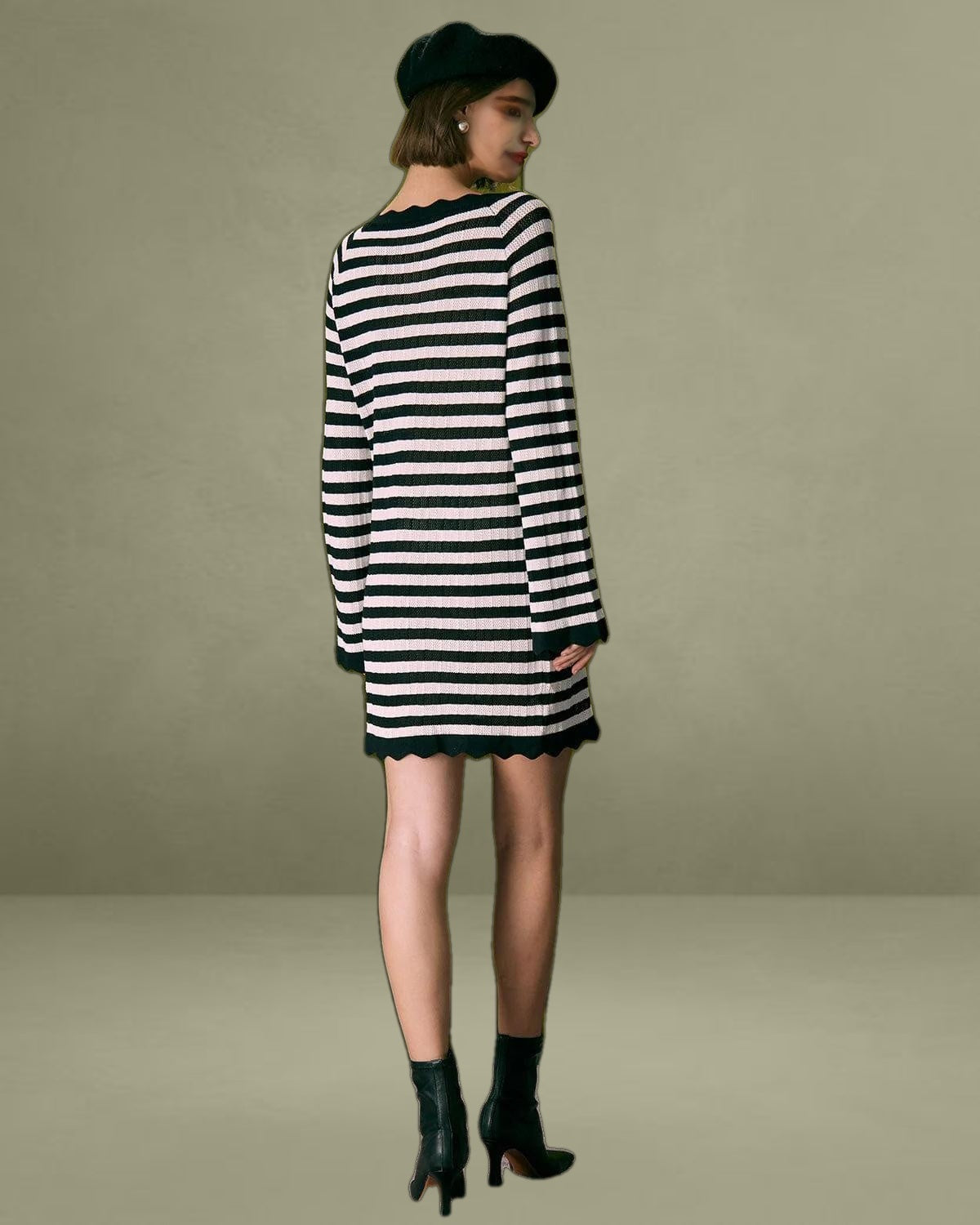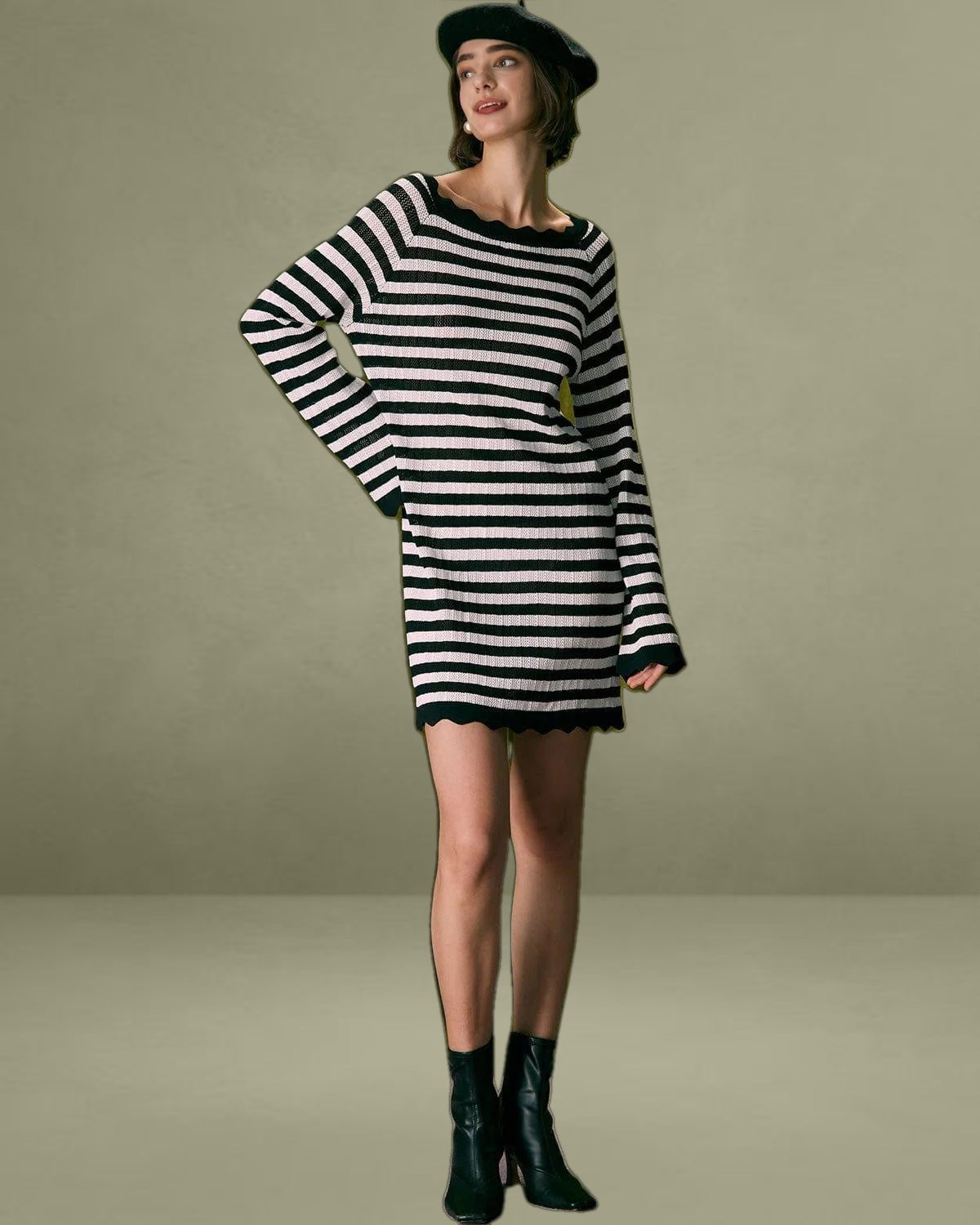 This Long Sleeve Mini Dress is a stunning and elegant dress that is perfect for any occasion. The round neck, flare sleeve and long sleeves deisgn adds a touch of sophistication to the dress, while the scalloped and striped deisgn add a unique and eye-catching element. The medium stretch and loose fit make it comfortable and easy to wear, while also creating a flattering silhouette that accentuates the figure.