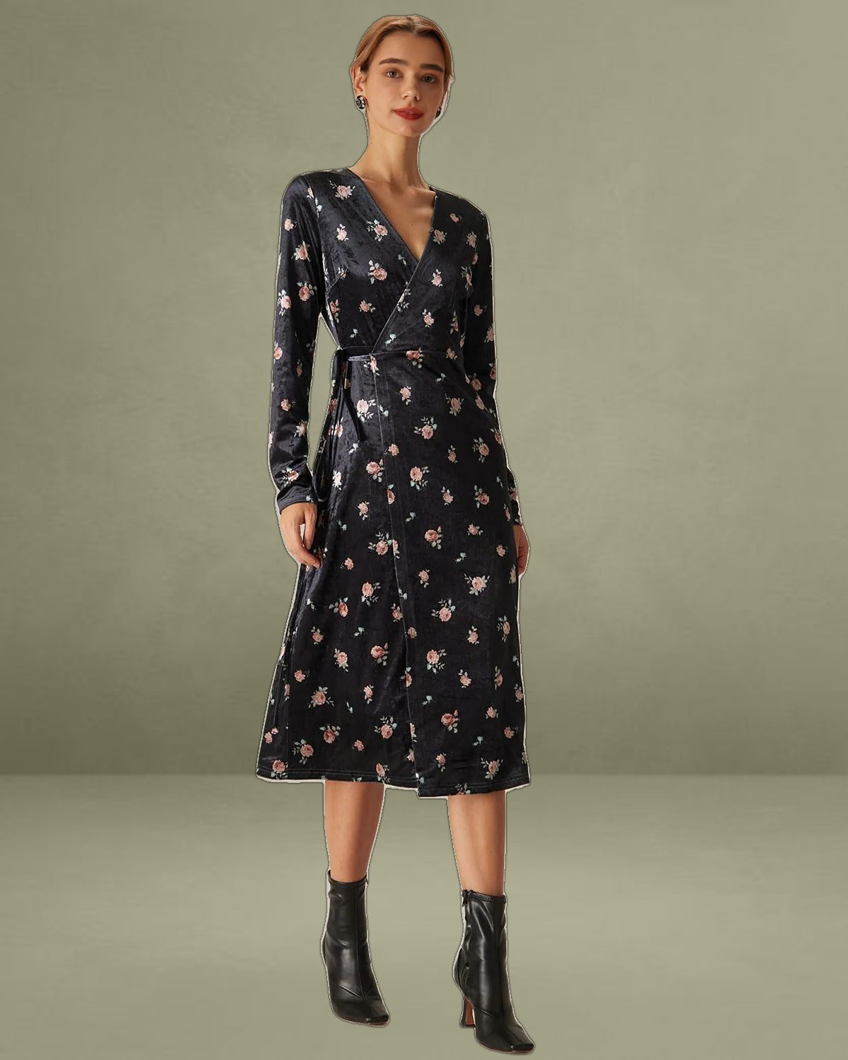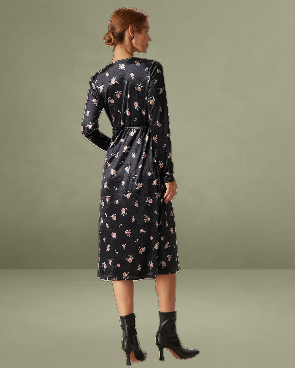 This V Neck Midi Dress is a perfect choice for any occasion. The long sleeve, natural waisted and medium stretch design of the dress adds movement and flow, making it easy to wear and dance in. The velvet and floral print detail adds a feminine touch and makes this dress perfect for any occasion. Whether you're going out on a date or attending a formal event, this dress is sure to turn heads and make you feel fabulous.
