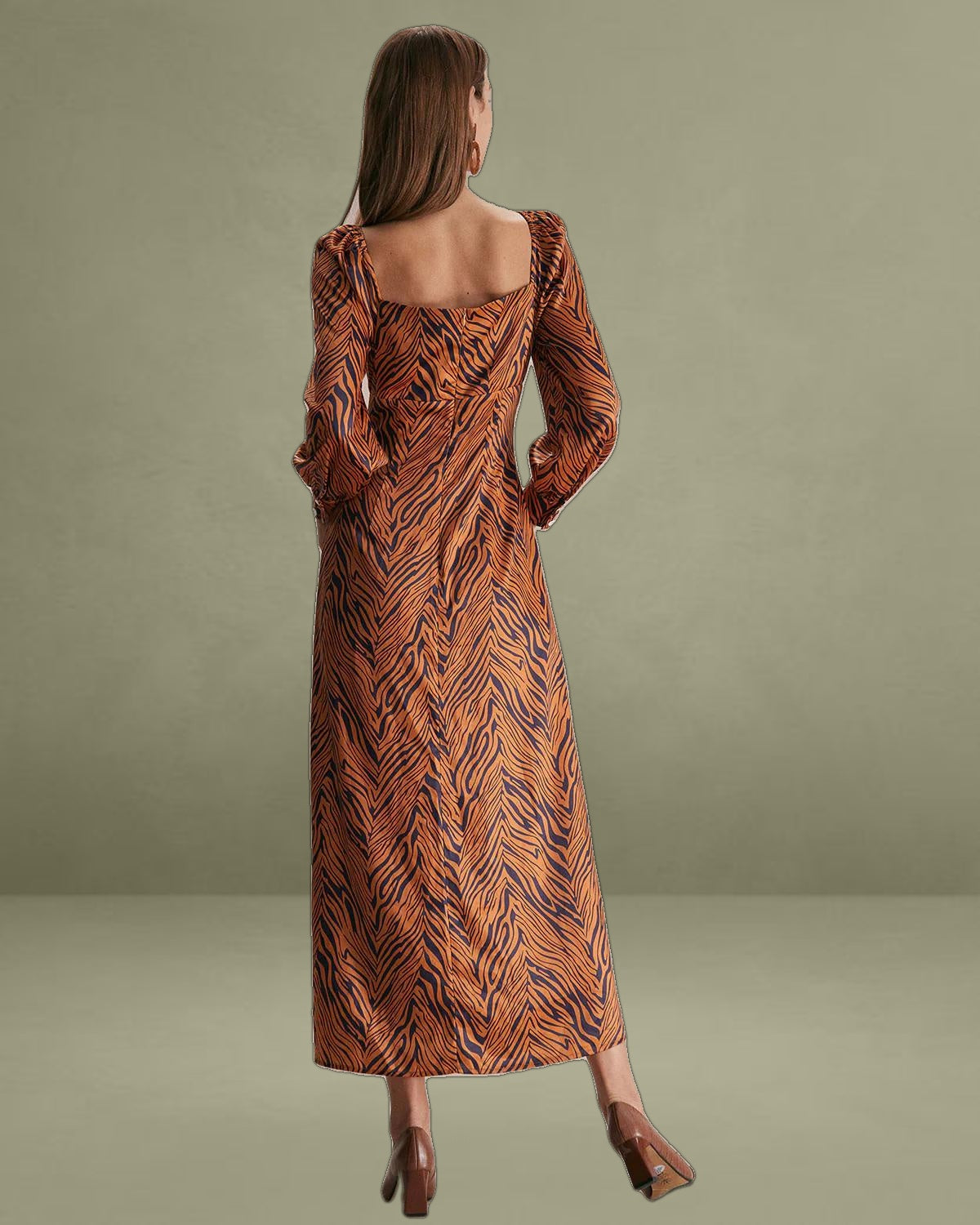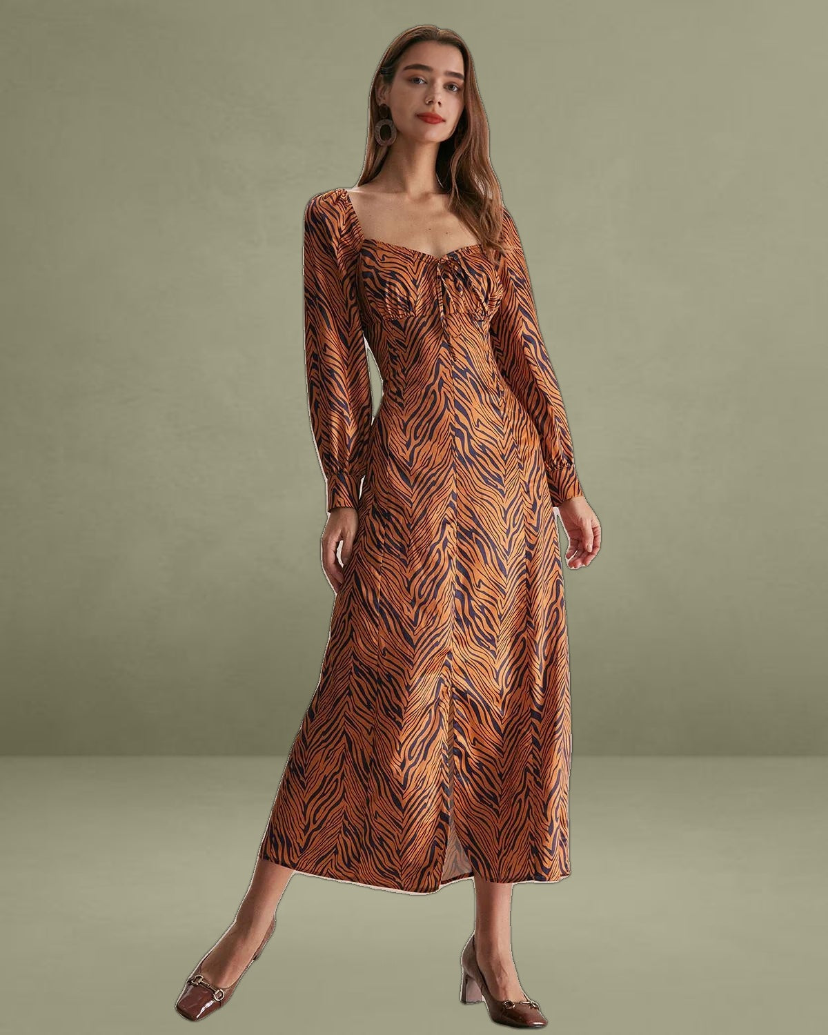 This Long Sleeve Maxi Dress is a perfect choice for any occasion. Its sweetheart neck, slit and slim fit accentuate your curves and make you feel confident and beautiful. The tie front, zebra print and zipper design adds a feminine touch and makes this dress perfect for any occasion. Whether you're going out on a date or attending a formal event, this dress is sure to turn heads and make you feel fabulous.