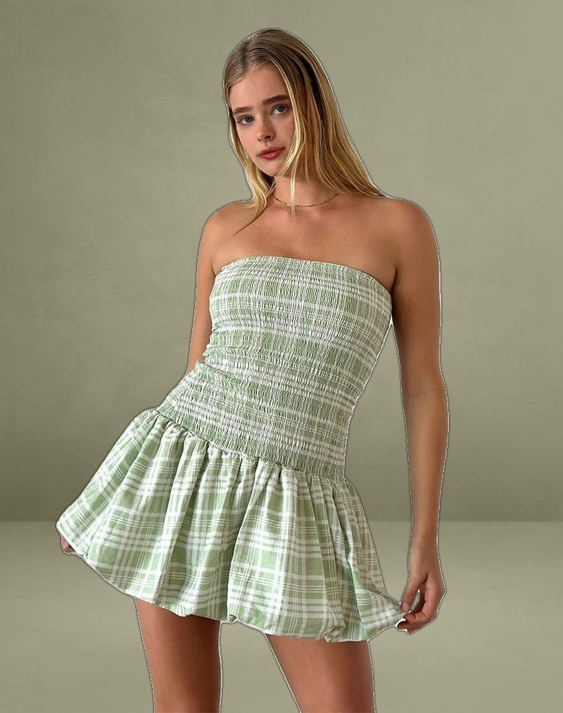 Introducing the Tilikum dress, in a table cloth neo mint fabric, if features a bandeau bodycon design with a shirred body and bubble skirt hem in a mini length.