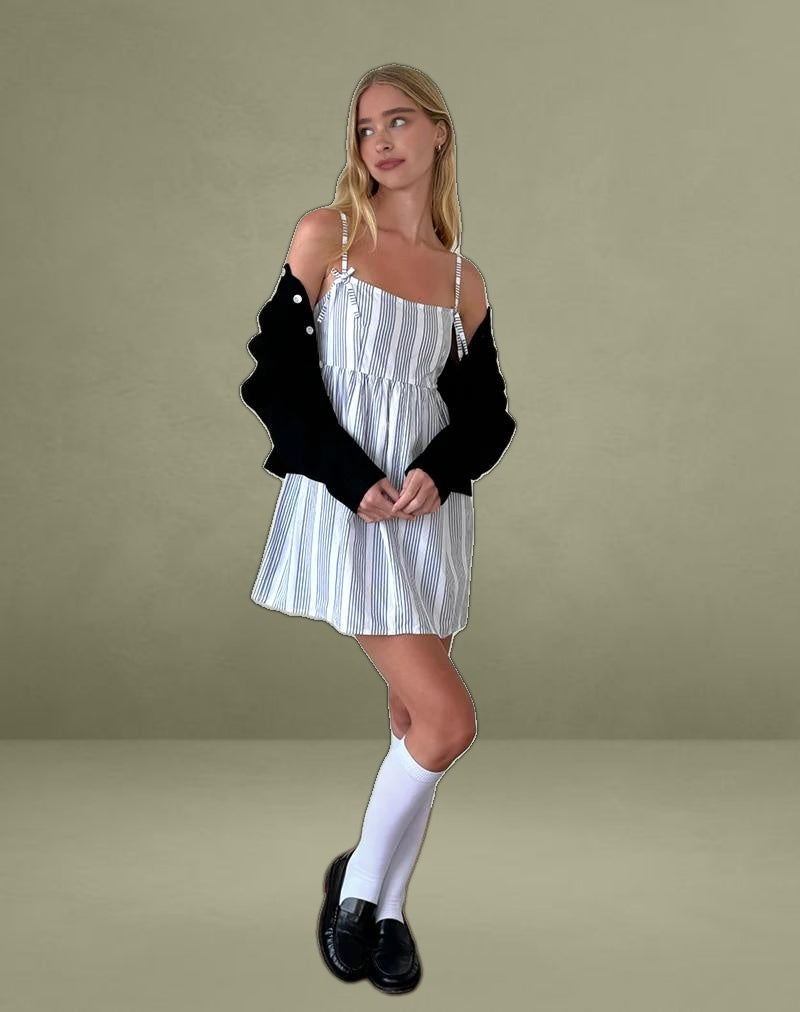 The Tisyani dress features a scoop neckline and cami straps with bows, in a mini length with a loose fit. In a vertical grey stripe woven fabric.