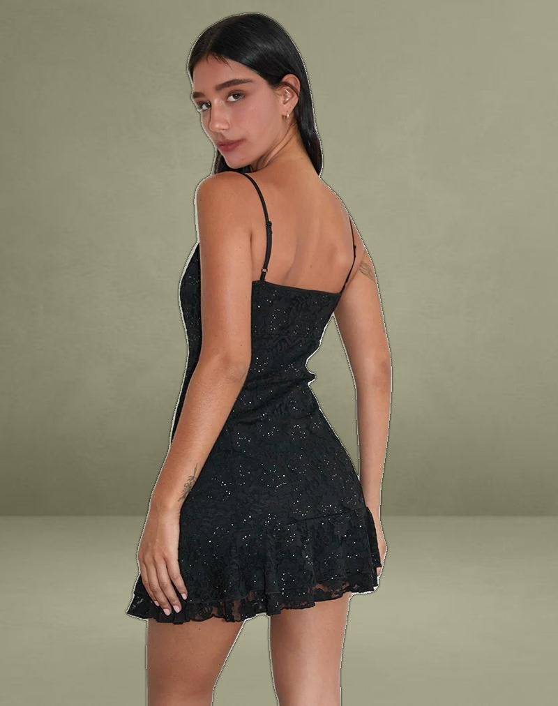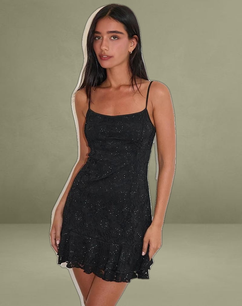 The Tita dress in a black lined sequin lace. Features a mini length fit with cami straps and a double frill hemline. Complete with seam detailing down the front.