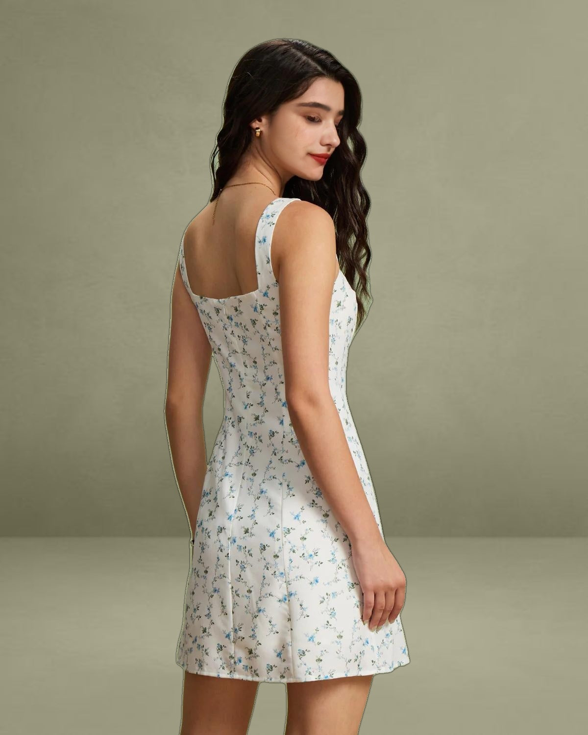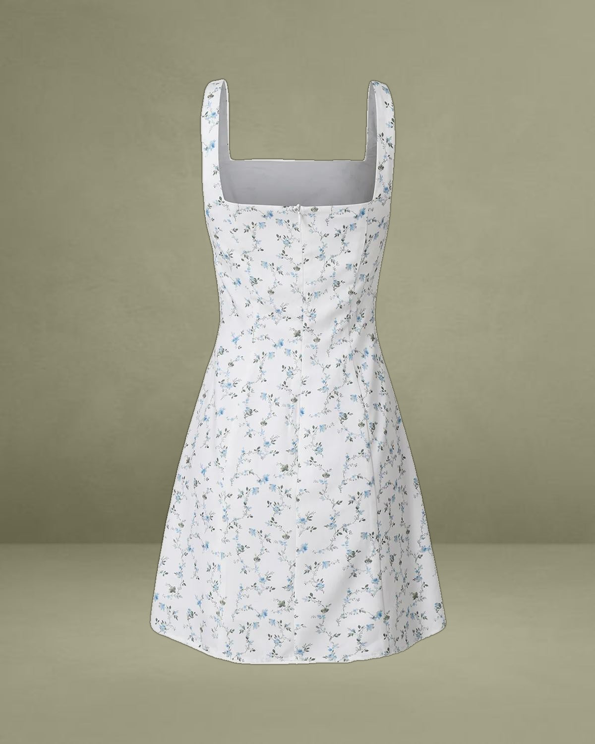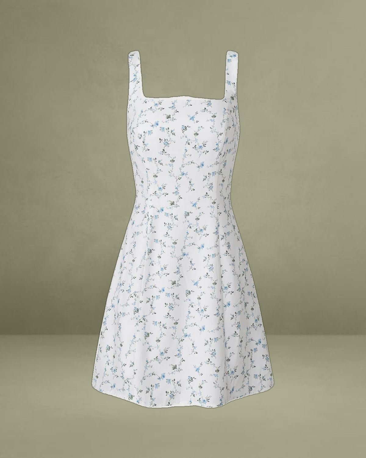 Designed with a charming square neckline and slim adjustable straps, this dress combines a flattering fit with a breezy silhouette. The soft white fabric is adorned with a delicate floral print, making it perfect for garden parties, beach outings, or casual days in the sun.