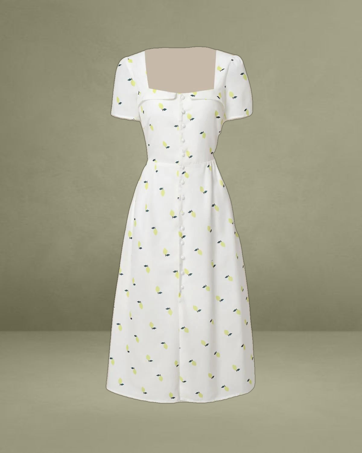 Featuring a flattering square neckline, delicate puff sleeves, and a fitted bodice that flows into a graceful midi-length skirt, this dress is adorned with a whimsical fruit print that adds a fresh, seasonal touch. Perfect for picnics, garden parties, or casual strolls, its breathable fabric ensures all-day comfort and effortless style.