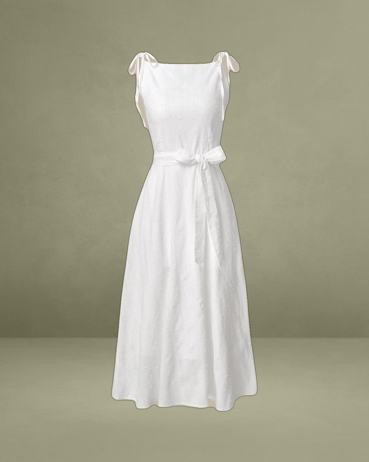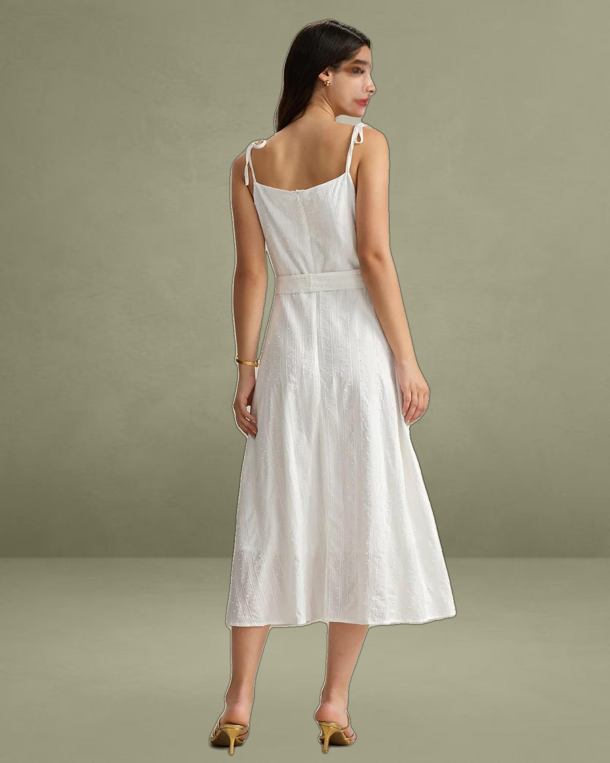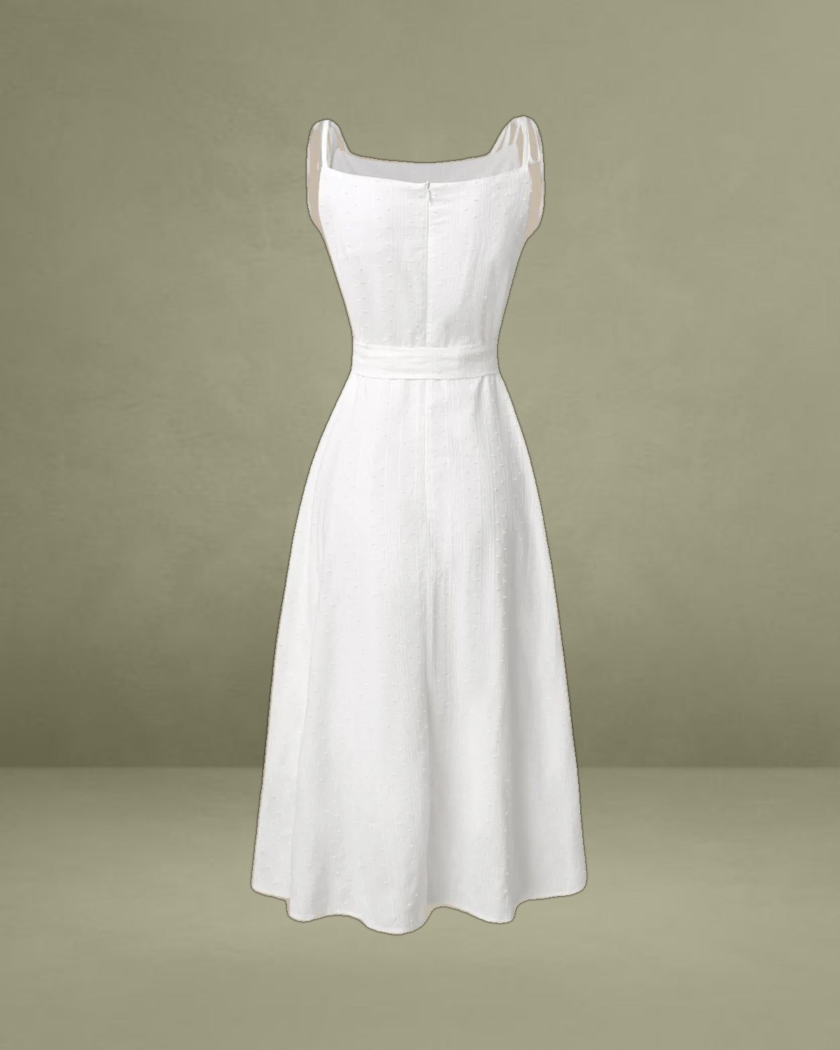 Designed with a flattering square neckline and a sleek slip silhouette, this midi dress is elevated by its subtly textured fabric that adds depth and charm. The crisp white hue offers a fresh, timeless appeal, perfect for warm-weather outings, garden parties, or casual celebrations.