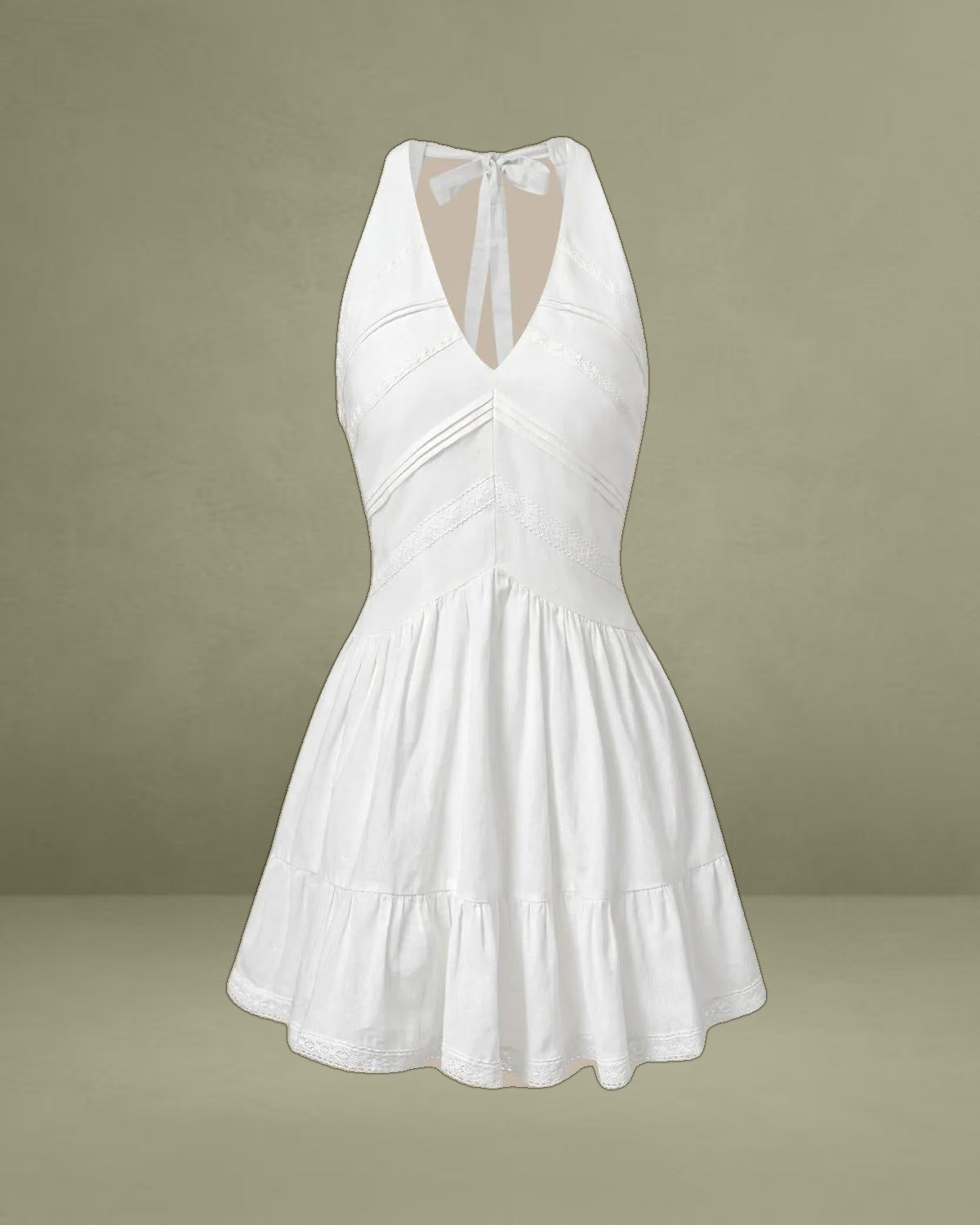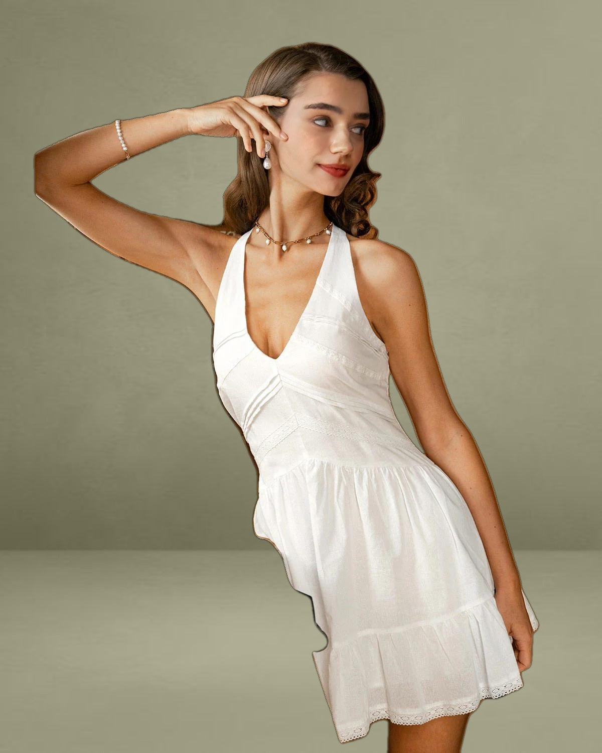 Designed to flatter, this chic piece features a plunging V-neckline, soft pleats that create graceful movement, and a daring open-back silhouette that adds a touch of allure. The crisp white fabric brings a fresh, clean vibe perfect for summer days, beach getaways, or dreamy date nights. Lightweight and breathable, it's the ultimate blend of comfort and style.