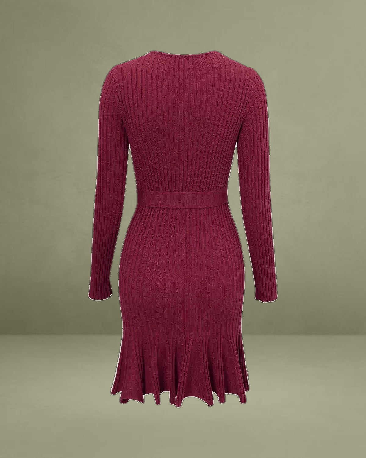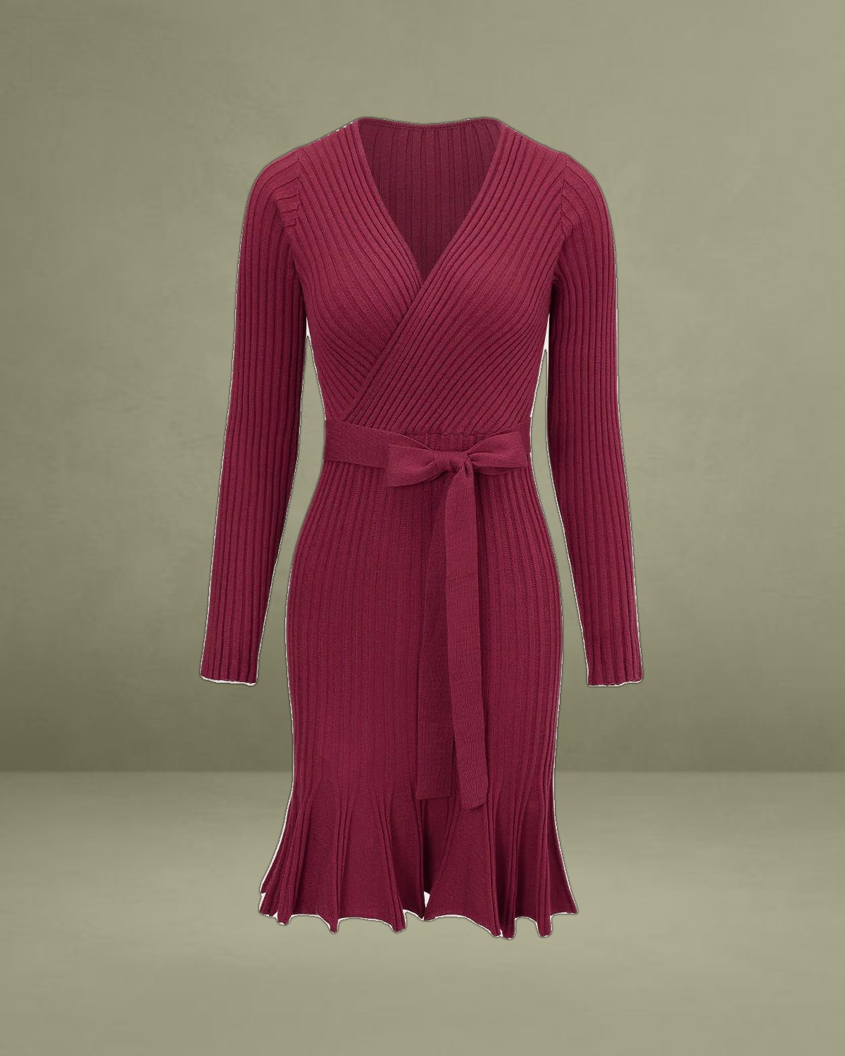 Made from a soft, knitted fabric, it features a flattering wrap design that cinches at the waist, creating a feminine, hourglass silhouette. The rich wine red color adds a touch of sophistication, while the mini length offers a playful yet elegant look.