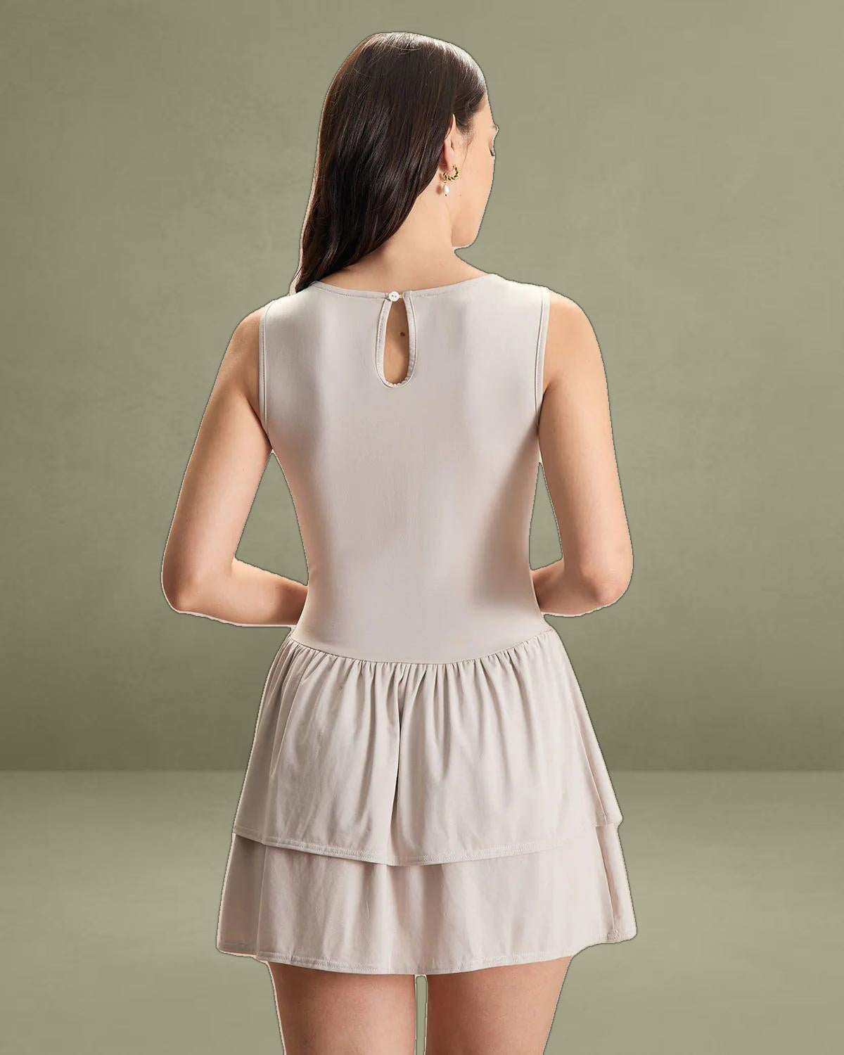 Featuring a classic round neckline, this dress offers a timeless appeal while the tiered design adds a playful and feminine touch. The mini length keeps the look modern and fresh, perfect for a variety of occasions from casual days out to more dressed-up events.