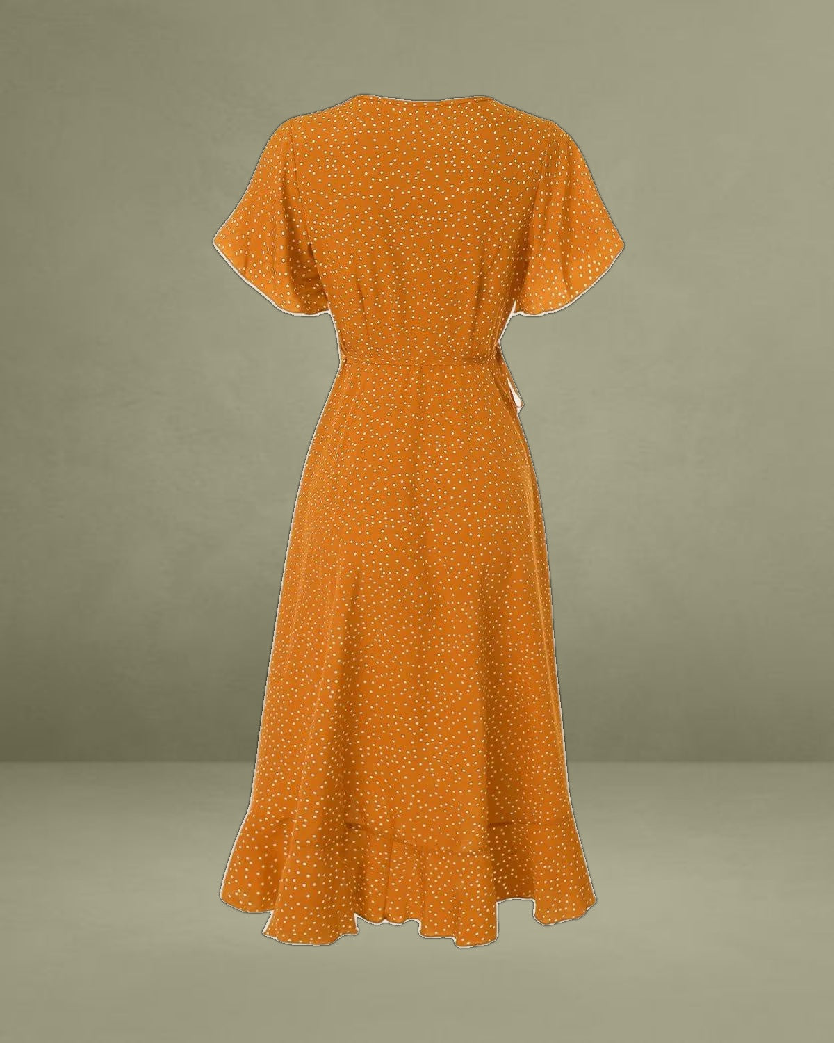 Polka dots can always bring out a woman's charm. Features like a v-neck, wrap style, and tied waist add elegance and allure. The high-waisted design can improve body proportions, making the wearer look taller. The ruffled edges give a playful touch. This design is very popular, whether it's a long ruffled yellow dress or a yellow and black polka dot dress. These dresses combine personality and classic appeal, making any yellow ruffled dress with polka dots a great choice for polka dot lovers.