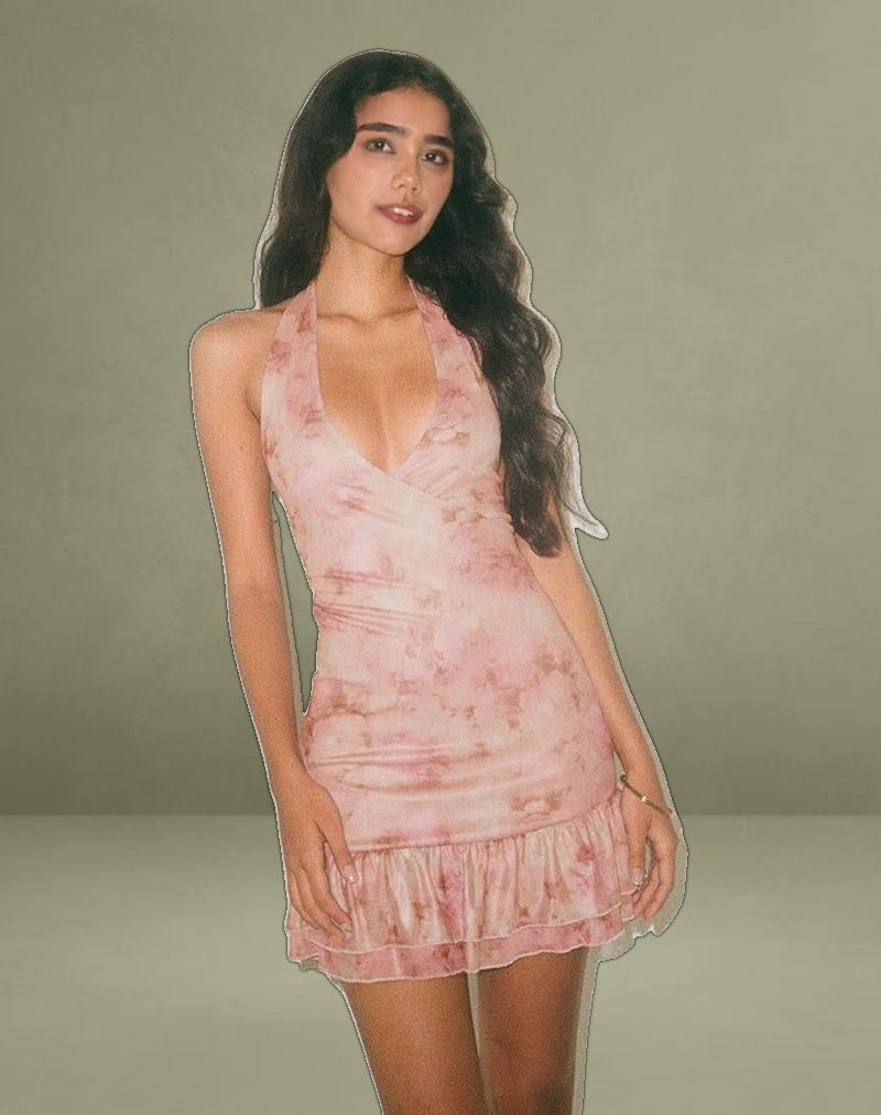 The Yoriko mini dress in a smoky floral peach printed lurex fabric, features a bodycon fit with a plunge neckline and halterneck straps. It boasts a ruffle hemline and wrap around detailing at the bust.